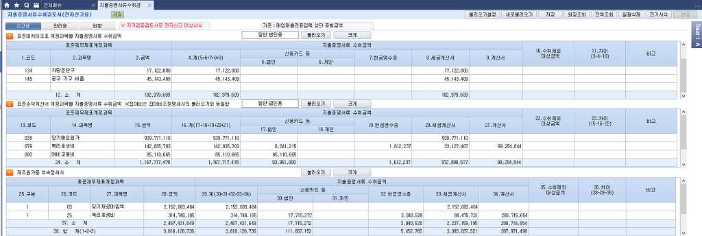직전연도 매출 20억 이상 지출증명서류 검토 : 회계 => 재무회계 => 결산장부 [ 더존 스마트 A ] 직전연도매출액 20억이상