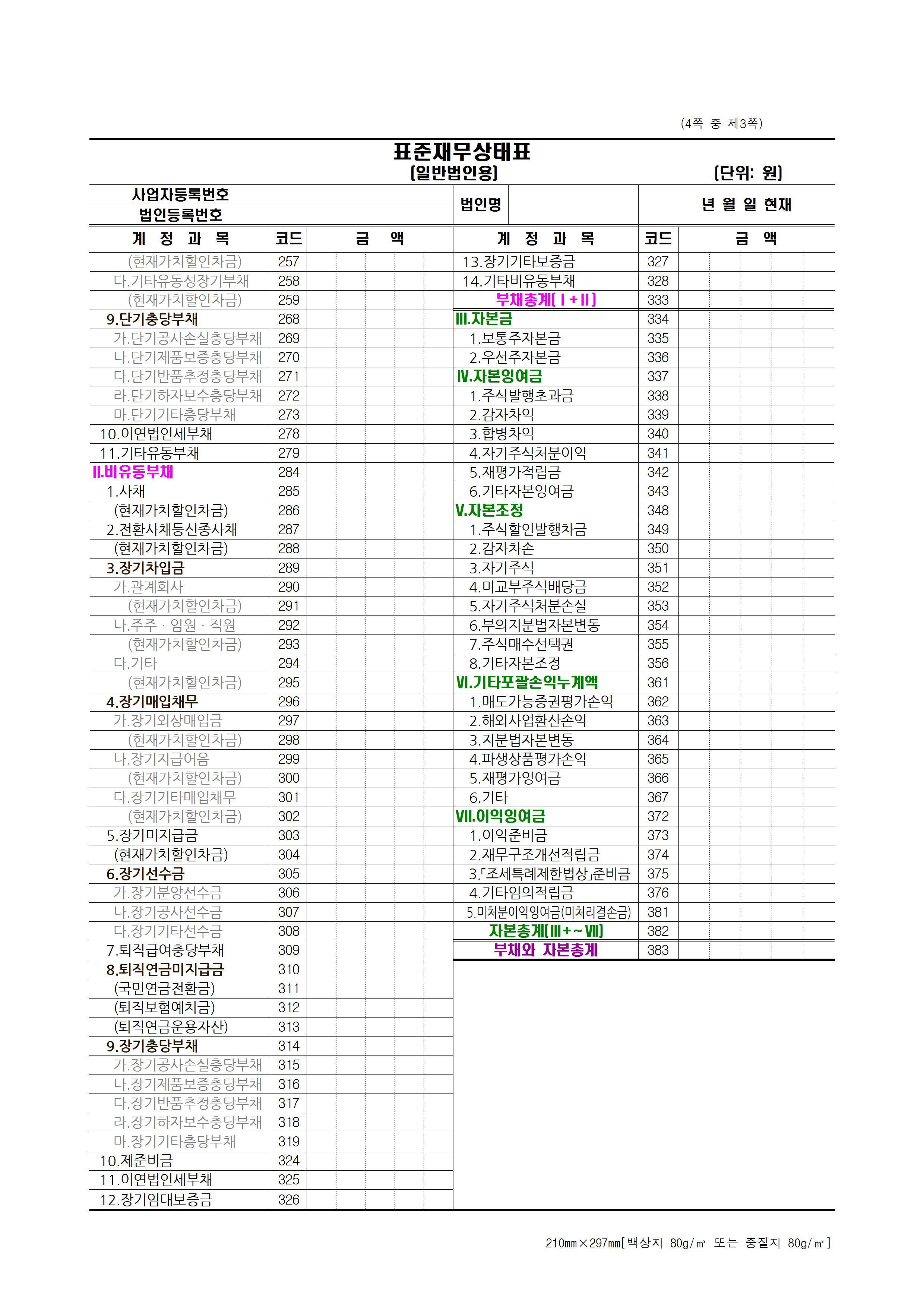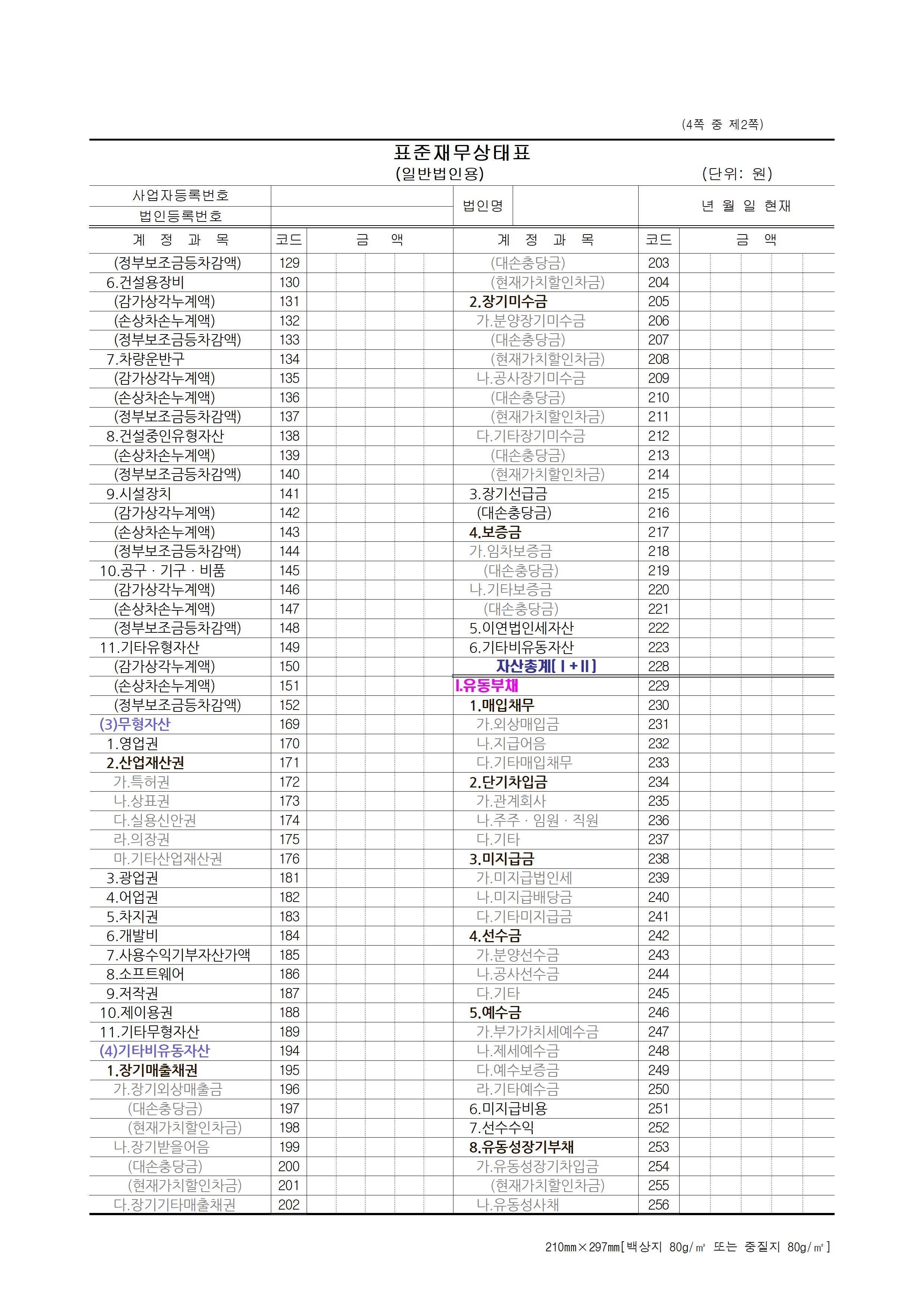 - jpg 파일 [별지 제3호의2서식] 표준재무상태표(일반법인용)¸ 합계표준재무상태표(일반법인용)¸ 표준재무상태표(금융ㆍ보험ㆍ증권업 법인용)¸ 합계표준재무상태표(금융ㆍ보험ㆍ증권업 법인용)(법인세법 시행규칙)017.jpg 다운로드
