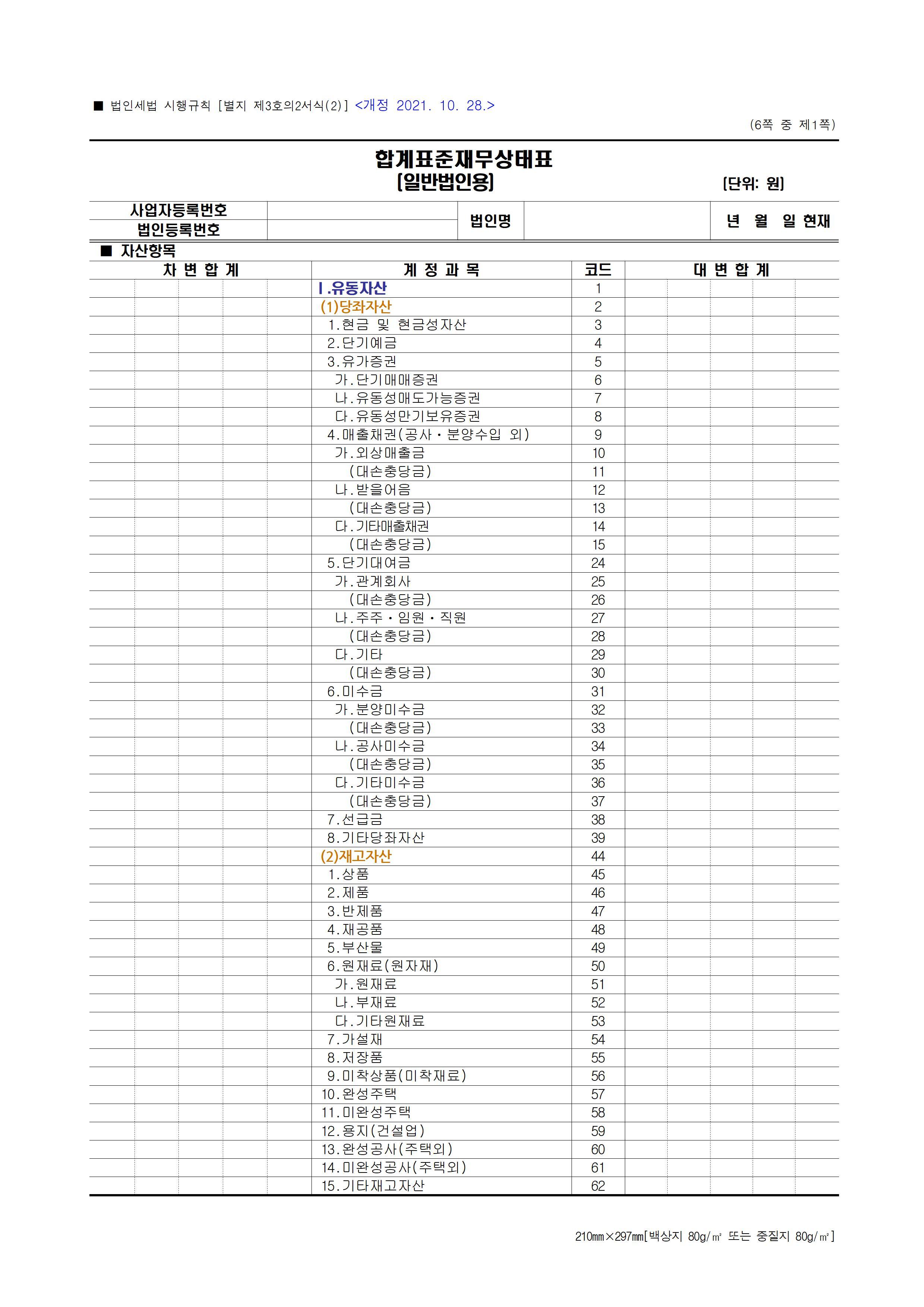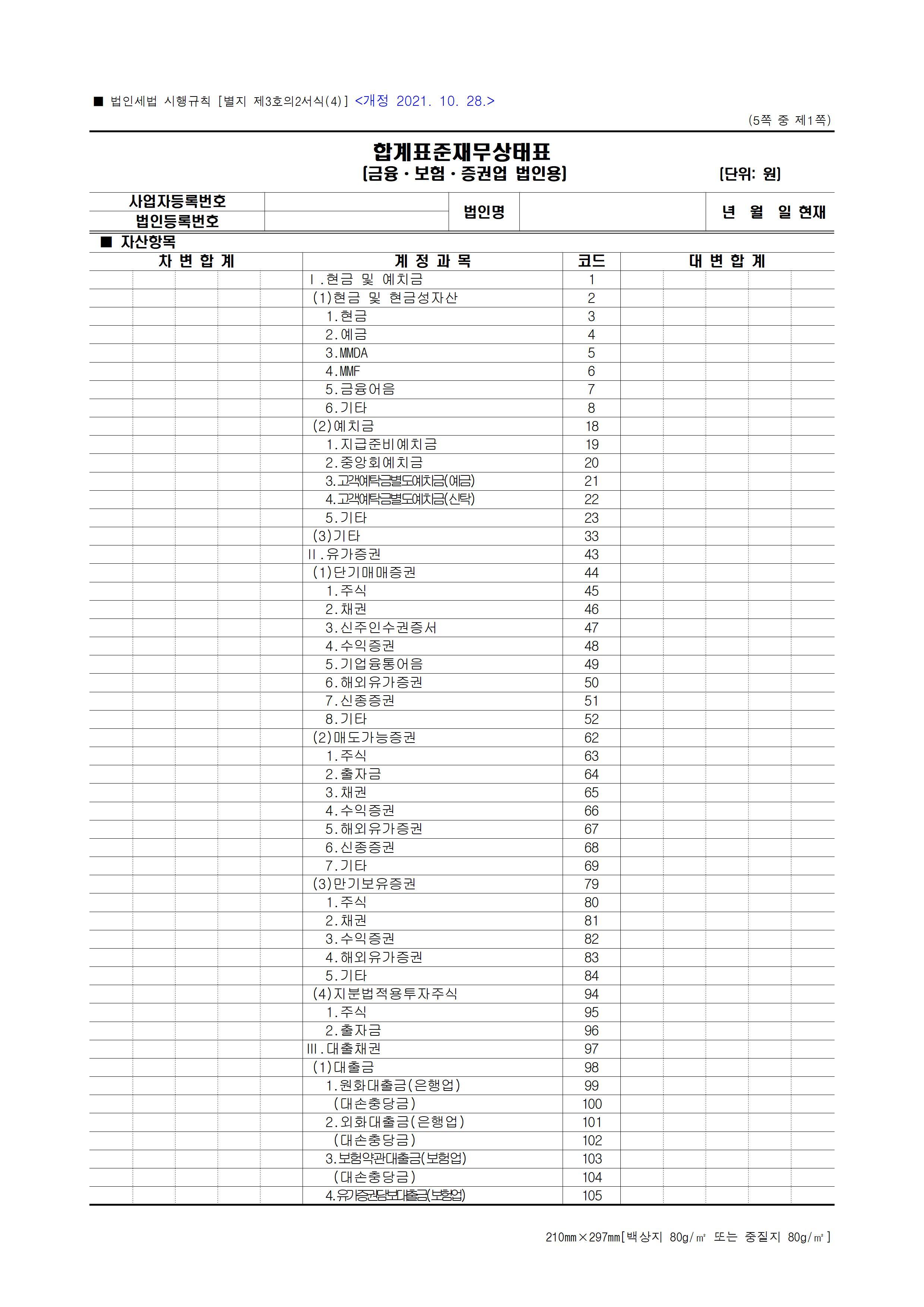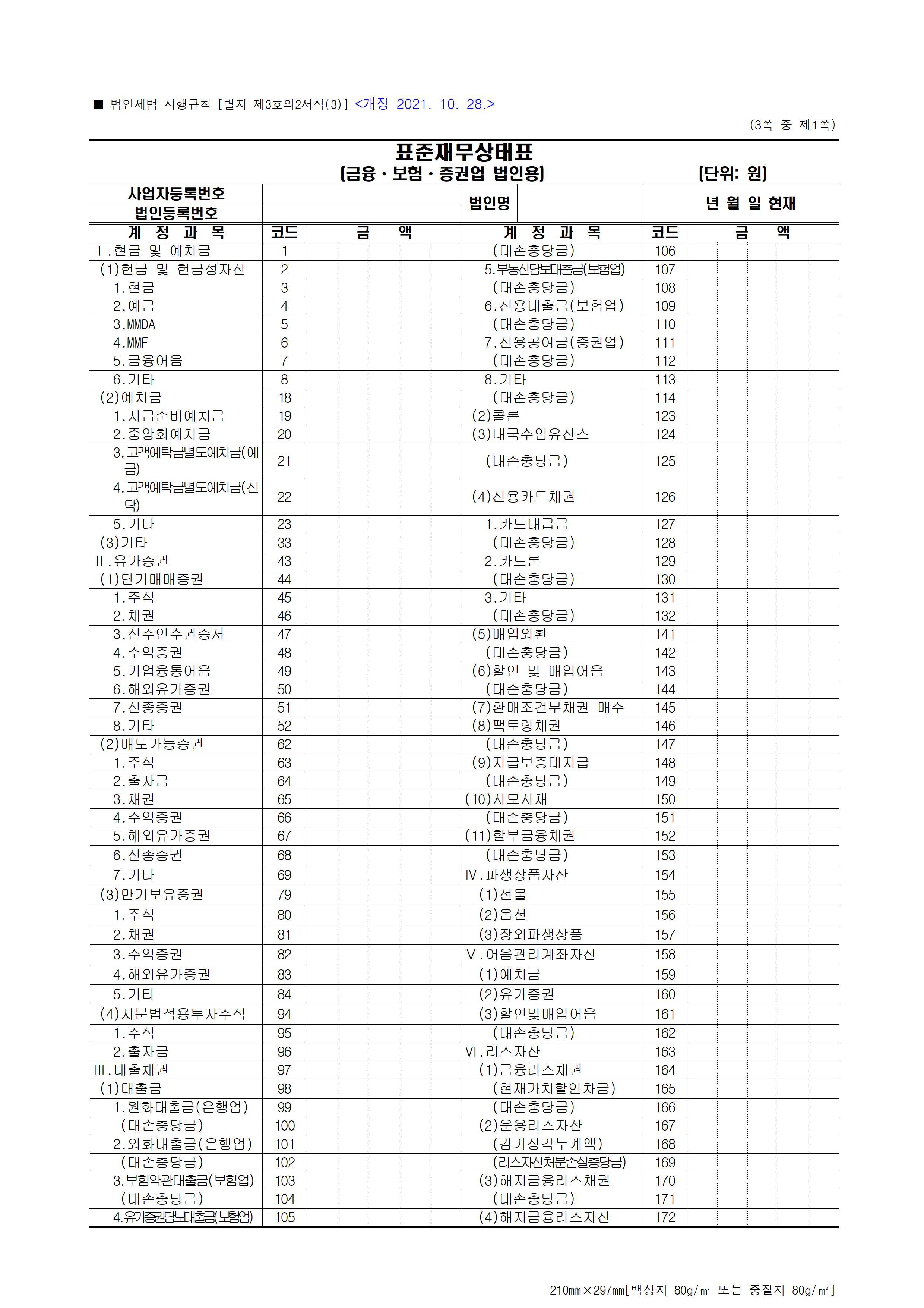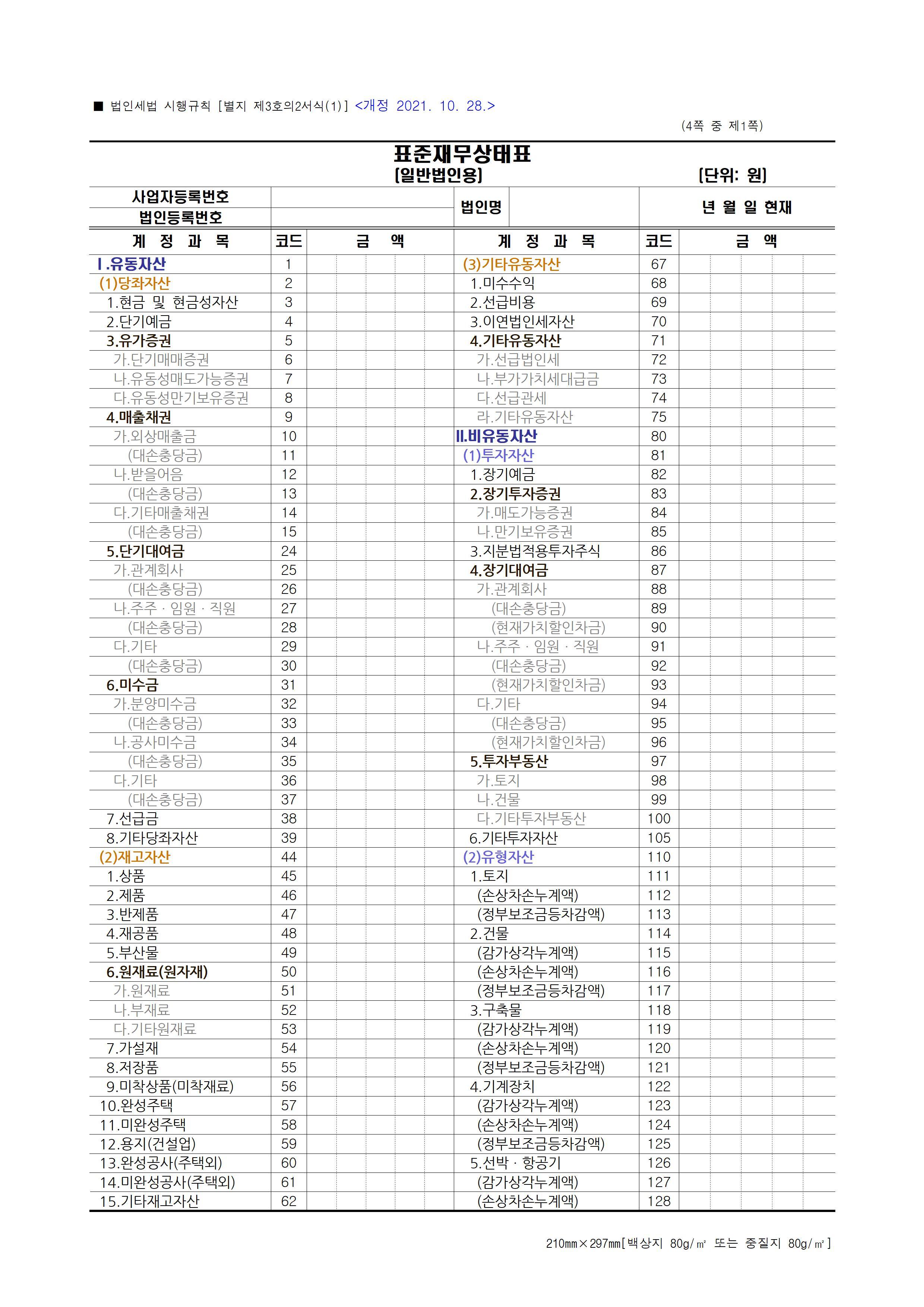 - jpg 파일 [별지 제3호의2서식] 표준재무상태표(일반법인용)¸ 합계표준재무상태표(일반법인용)¸ 표준재무상태표(금융ㆍ보험ㆍ증권업 법인용)¸ 합계표준재무상태표(금융ㆍ보험ㆍ증권업 법인용)(법인세법 시행규칙)011.jpg 다운로드