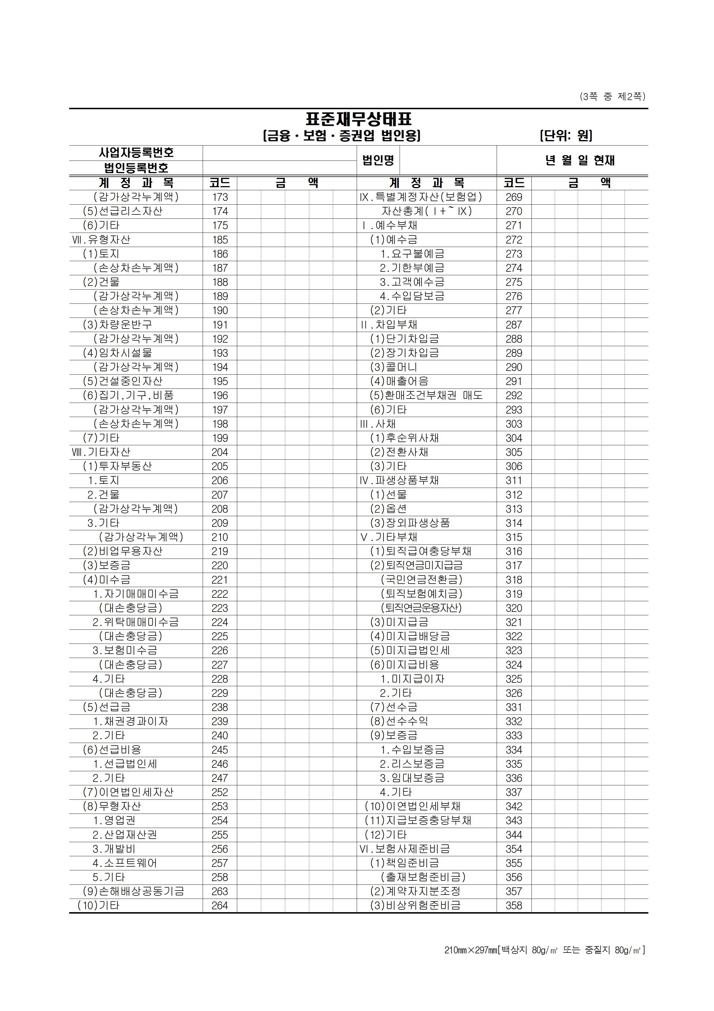 - jpg 파일 [별지 제3호의2서식] 표준재무상태표(일반법인용)¸ 합계표준재무상태표(일반법인용)¸ 표준재무상태표(금융ㆍ보험ㆍ증권업 법인용)¸ 합계표준재무상태표(금융ㆍ보험ㆍ증권업 법인용)(법인세법 시행규칙)016.jpg 다운로드