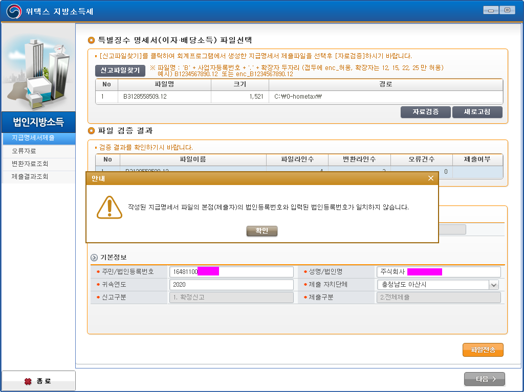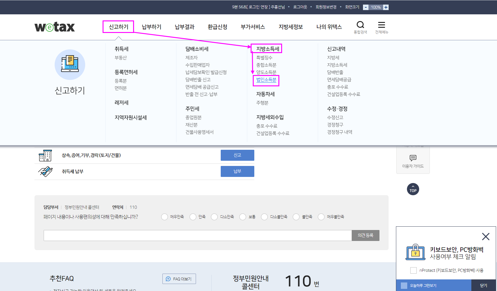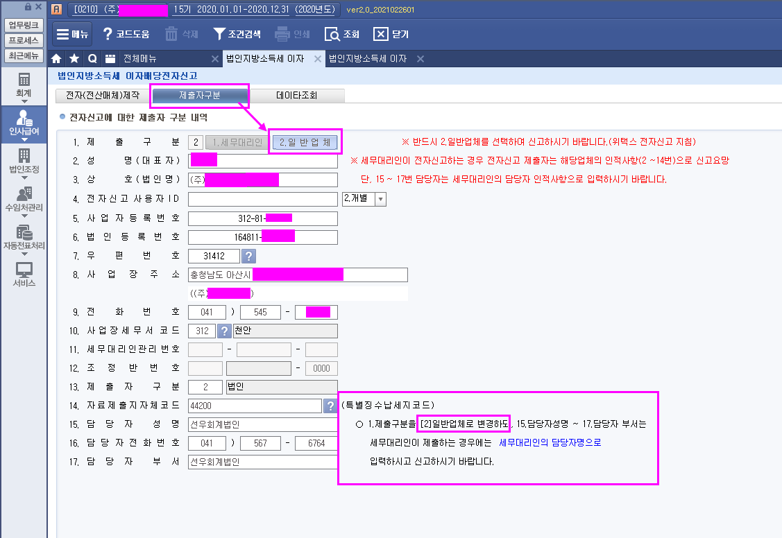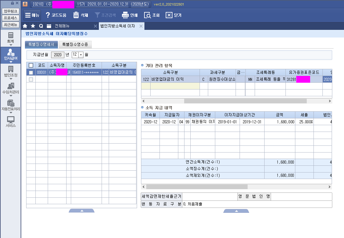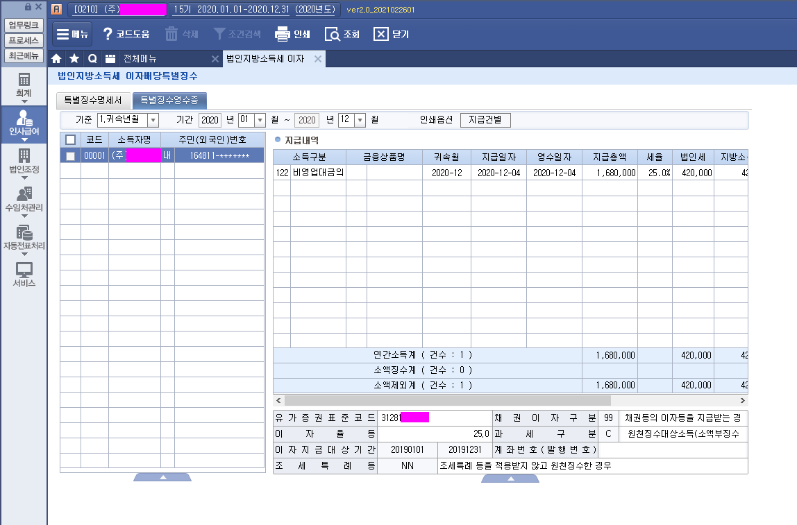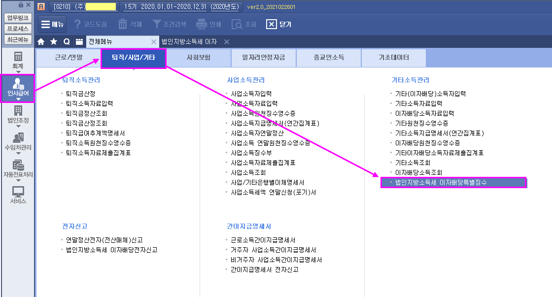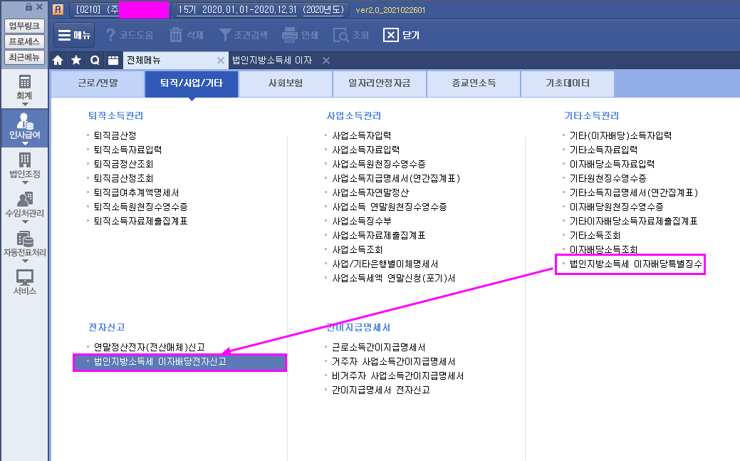 인사급여 -> 퇴직/사업/기타 - > 법인지방소득세 이자배당특별징수 -> 법인지방소득세 이자배당전자신고