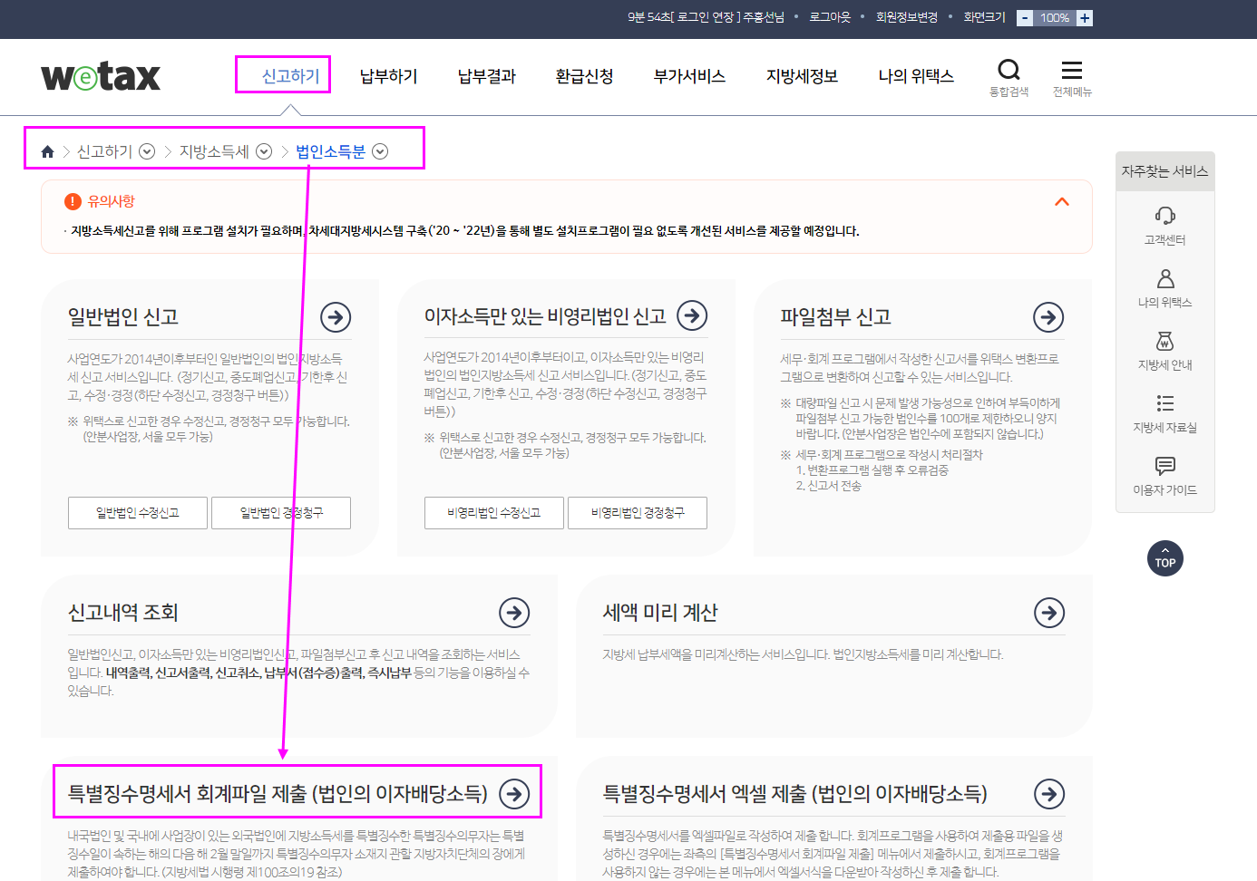 ※ 법인 위임신고의 경우 wetax에서 다음 해 2월 말일까지 특별징수 명세서도 제출,hometax에서 이자지급명세서도 제출
