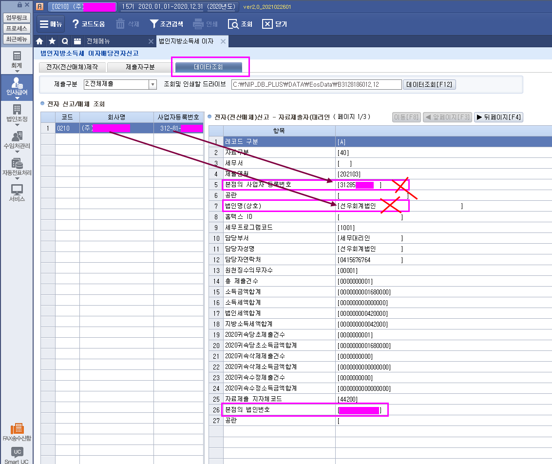 데이타조회 일반업체로 되어 있는지 세무대리인으로 되어 있는지.