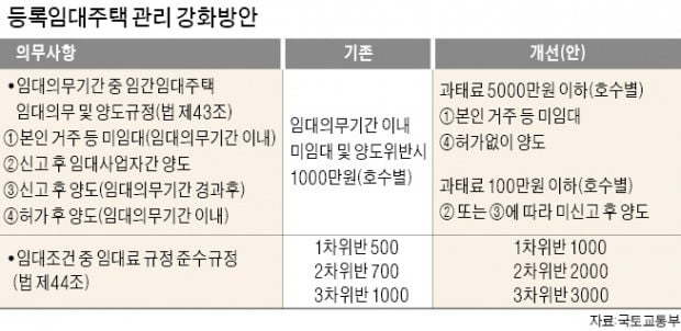 임대조건을 위반하여 민간임대주택을 임대한 경우 부과하는 과태료를 현행 1천만 원에서 3천만 원 으로 상향하였습니다.