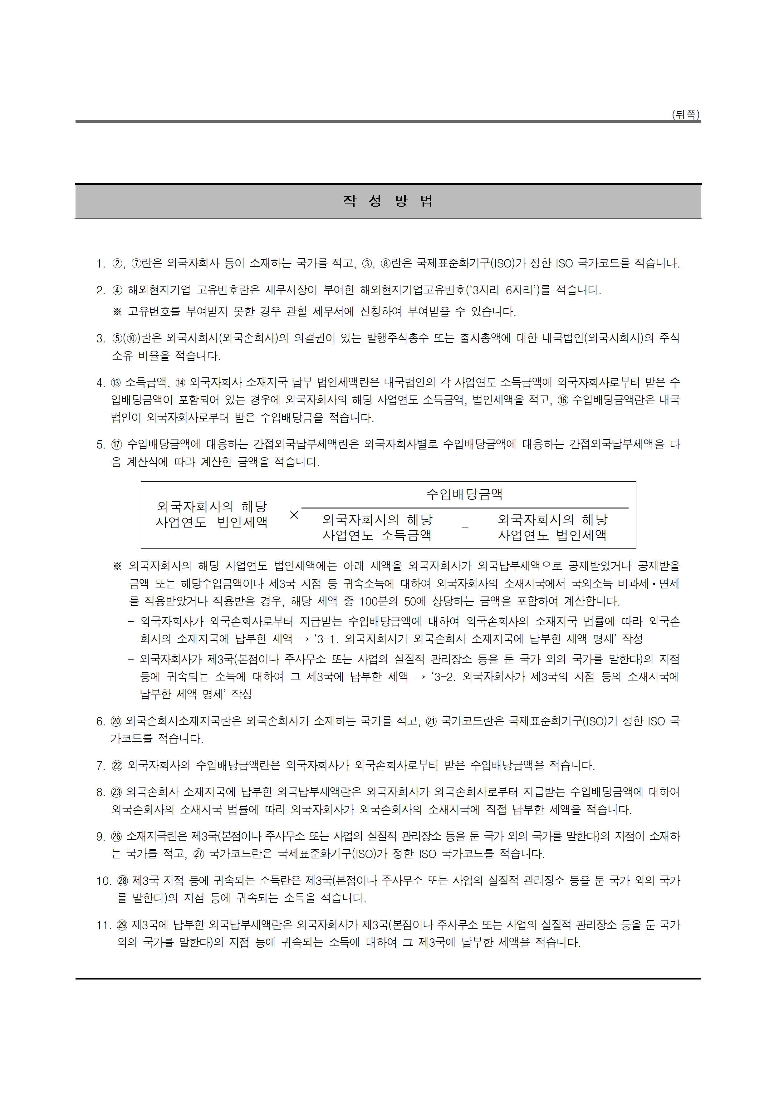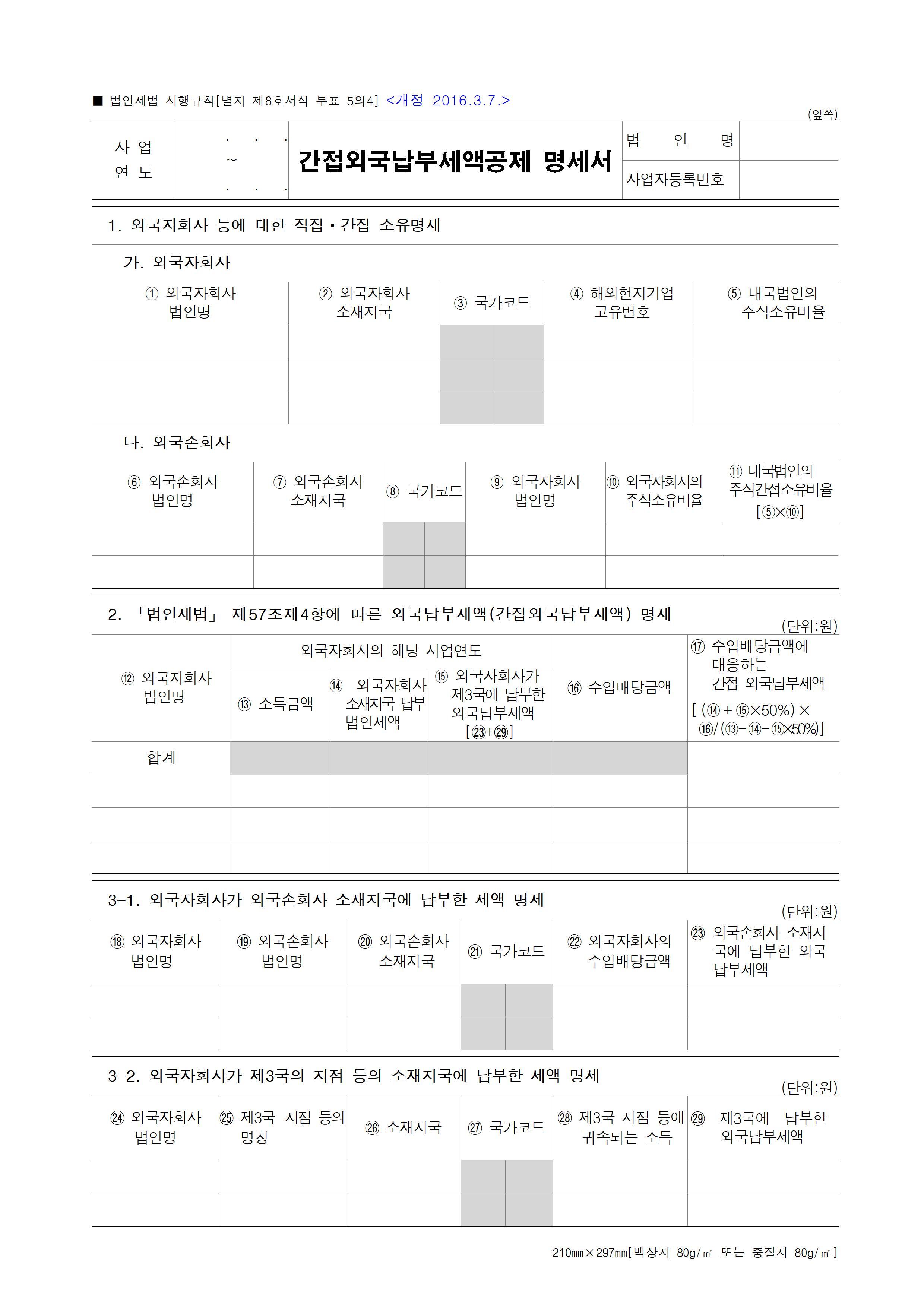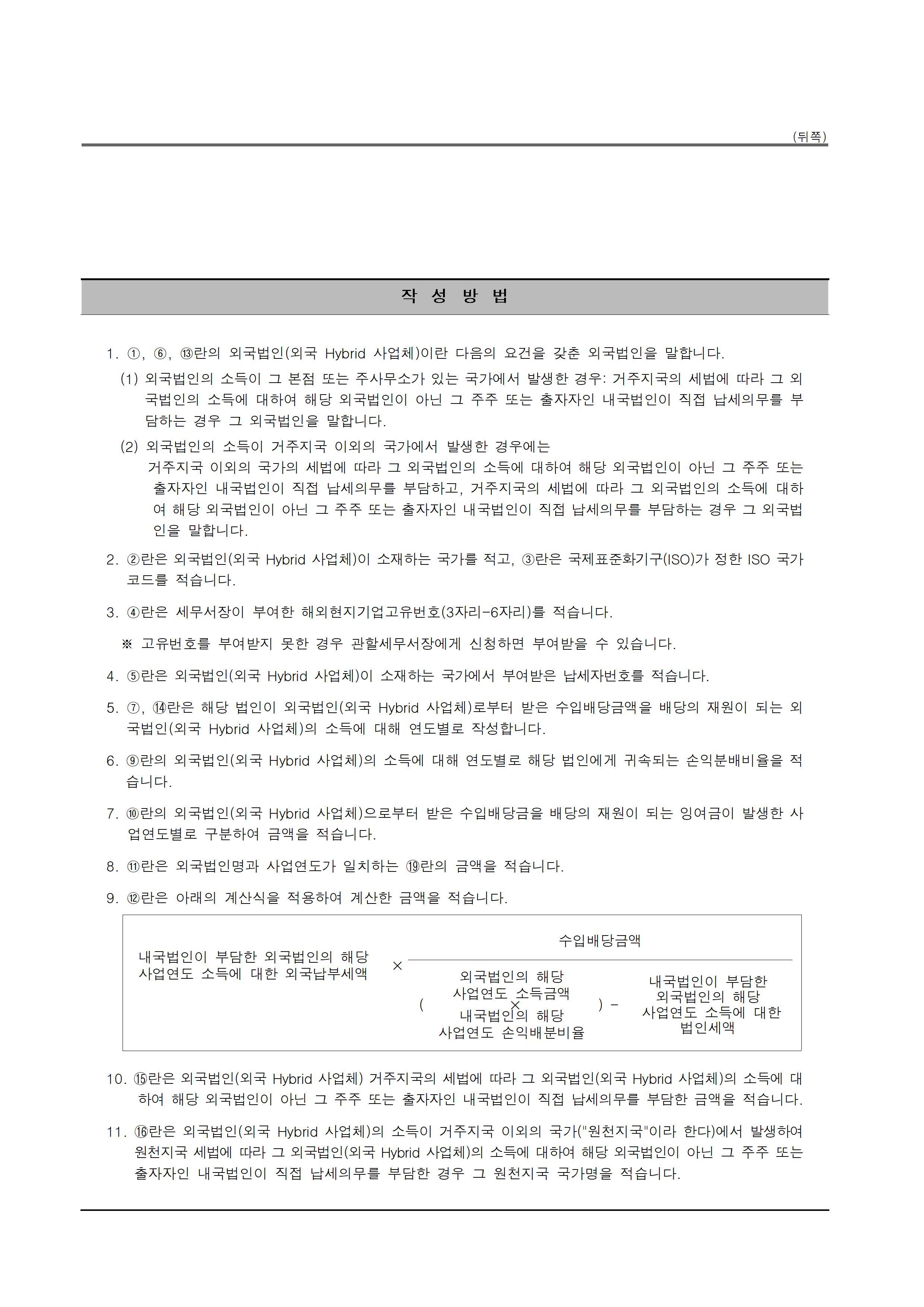 ④ 국제조세조정에관한법률시행규칙 별지 서식 작성자주황규|작성시간21.11.03|조회수330 목록 댓글 0 글자크기 작게가 글자크기 크게가 국제거래 (2021-11-03) 주황규.pdf711.10KB 국제조세조정에관한법률시행규칙 https://www.law.go.kr/%EB%B2%95%EB%A0%B9/%EA%B5%AD%EC%A0%9C%EC%A1%B0%EC%84%B8%EC%A1%B0%EC%A0%95%EC%97%90%EA%B4%80%ED%95%9C%EB%B2%95%EB%A5%A0%EC%8B%9C%ED%96%89%EA%B7%9C%EC%B9%99국제조세조정에관한법률시행규칙www.law.go.kr국제조세조정에관한법률시행규칙국제조세조정에관한법률시행규칙www.law.go.kr[별지 제47호서식] 해외현지법인 명세서(국제조세조정에 관한 법률 시행규칙).pdf88.03KB[별지 제48호서식] 해외현지법인 재무상황표(확정분¸ 가결산)(국제조세조정에 관한 법률 시행규칙).pdf73.92KB[별지 제49호서식] 손실거래명세서(국제조세조정에 관한 법률 시행규칙).pdf73.83KB[별지 제50호서식] 해외영업소 설치현황표(국제조세조정에 관한 법률 시행규칙).pdf70.67KB[별지 제51호서식] 해외부동산 취득ㆍ투자운용(임대) 및 처분 명세서(국제조세조정에 관한 법률 시행규칙).pdf75.82KB[별지 제52호서식] 취득자금 소명대상 금액의 출처 확인서(국제조세조정에 관한 법률 시행규칙).pdf78.59KB 외국기업본점등의 공통경비배분계산서.pdf168.05KB [별지 제16호서식] 국제거래명세서¸ 지급보증 용역거래 명세서(국제조세조정에 관한 법률 시행규칙).pdf101.67KB [별지 제17호서식] 국외특수관계인의 요약손익계산서(국제조세조정에 관한 법률 시행규칙).pdf70.45KB[별지 제26호서식] 국외특수관계인에게 지급하는 순이자비용에 대한 조정 명세서(갑¸ 을)(국제조세조정에 관한 법률 시행규칙).pdf61.93KB[별지 제30호서식] 특정외국법인의 유보소득계산 명세서(갑¸ 을)(국제조세조정에 관한 법률 시행규칙).pdf92.06KB [별지 제20호서식] 정상가격 산출방법 신고서(국제조세조정에 관한 법률 시행규칙).pdf63.95KB[별지 제19호서식] 무형자산에 대한 정상가격 산출방법 신고서(국제조세조정에 관한 법률 시행규칙).pdf74.45KB[별지 제18호서식] 용역거래에 대한 정상가격 산출방법 신고서(국제조세조정에 관한 법률 시행규칙).pdf75.82KB[별지 제1호서식] 거래가격 조정신고서(국제조세조정에 관한 법률 시행규칙).pdf56.61KB[별지 제33호서식] 국외 출자 명세서(국제조세조정에 관한 법률 시행규칙).pdf55.58KB[별지 제24호서식] 국외지배주주에게 지급하는 이자등에 대한 조정 명세서(갑¸ 을¸ 병¸ 정)(국제조세조정에 관한 법률 시행규칙).pdf98.87KB[별지 제25호서식] 국외지배주주에 대한 원천징수세액 조정 명세서(국제조세조정에 관한 법률 시행규칙).pdf43.20KB[별지 제31호서식] 특정외국법인의 유보소득 합산과세 판정 명세서(갑¸ 을¸ 병)(국제조세조정에 관한 법률 시행규칙).pdf107.65KB[별지 제32호서식] 특정외국법인의 유보소득 합산과세 적용범위 판정 명세서(갑¸ 을)(국제조세조정에 관한 법률 시행규칙).pdf92.54KB[별지 제51호서식] 해외부동산 취득ㆍ투자운용(임대) 및 처분 명세서(국제조세조정에 관한 법률 시행규칙).pdf75.82KB[별지 제27호서식] 혼성금융상품 관련 이자비용에 대한 조정 명세서(국제조세조정에 관한 법률 시행규칙).pdf59.04KB[별지 제20호 서식] 외국인 투자제한업종 경영상황보고서.pdf39.09KB[별지 제8호서식] 공제감면세액 및 추가납부세액합계표(갑¸ 을)¸ 공제감면세액계산서¸ 세액공제조정명세서¸ 국가별 외국납부세액공제 명세서¸ 소득종류별 외국납부세액 명세서¸ 간접외국납(법인세법 시행규칙).pdf384.33KB[별지 제8호서식] 공제감면세액 및 추가납부세액합계표(갑¸ 을)¸ 공제감면세액계산서¸ 세액공제조정명세서¸ 국가별 외국납부세액공제 명세서¸ 소득종류별 외국납부세액 명세서¸ 간접외국납(법인세법 시행규칙).hwp272.50KB 첨부파일첨부된 파일이 66개 있습니다. pdf 파일 [별지 제47호서식] 해외현지법인 명세서(국제조세조정에 관한 법률 시행규칙).pdf 다운로드 pdf 파일 [별지 제48호서식] 해외현지법인 재무상황표(확정분¸ 가결산)(국제조세조정에 관한 법률 시행규칙).pdf 다운로드 pdf 파일 [별지 제49호서식] 손실거래명세서(국제조세조정에 관한 법률 시행규칙).pdf 다운로드 pdf 파일 [별지 제50호서식] 해외영업소 설치현황표(국제조세조정에 관한 법률 시행규칙).pdf 다운로드 pdf 파일 [별지 제51호서식] 해외부동산 취득ㆍ투자운용(임대) 및 처분 명세서(국제조세조정에 관한 법률 시행규칙).pdf 다운로드 pdf 파일 [별지 제52호서식] 취득자금 소명대상 금액의 출처 확인서(국제조세조정에 관한 법률 시행규칙).pdf 다운로드 jpg 파일 외국기업본점등의 공통경비배분계산서.jpg 다운로드 pdf 파일 외국기업본점등의 공통경비배분계산서.pdf 다운로드 pdf 파일 [별지 제16호서식] 국제거래명세서¸ 지급보증 용역거래 명세서(국제조세조정에 관한 법률 시행규칙).pdf 다운로드 pdf 파일 [별지 제17호서식] 국외특수관계인의 요약손익계산서(국제조세조정에 관한 법률 시행규칙).pdf 다운로드 pdf 파일 [별지 제26호서식] 국외특수관계인에게 지급하는 순이자비용에 대한 조정 명세서(갑¸ 을)(국제조세조정에 관한 법률 시행규칙).pdf 다운로드 pdf 파일 [별지 제30호서식] 특정외국법인의 유보소득계산 명세서(