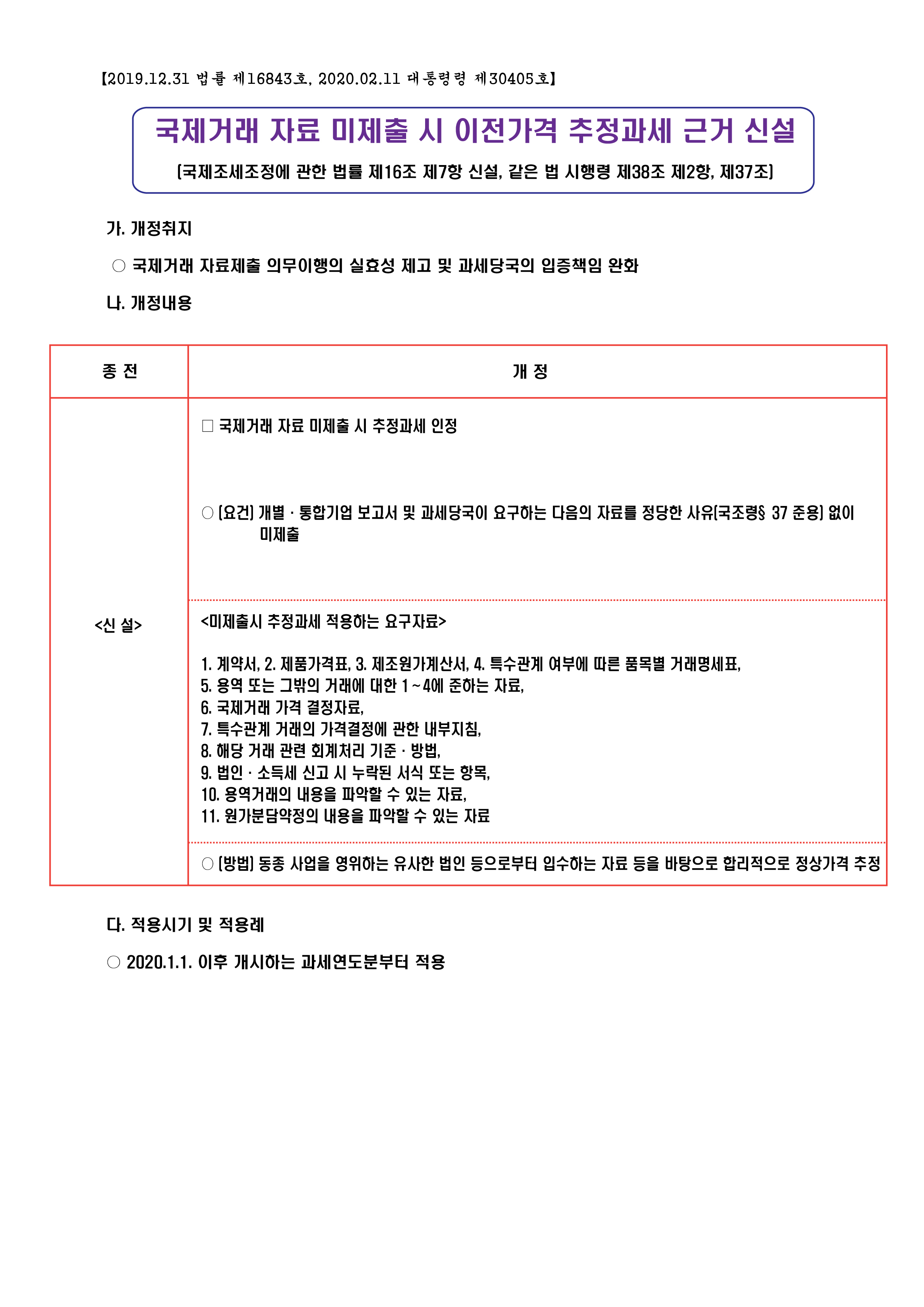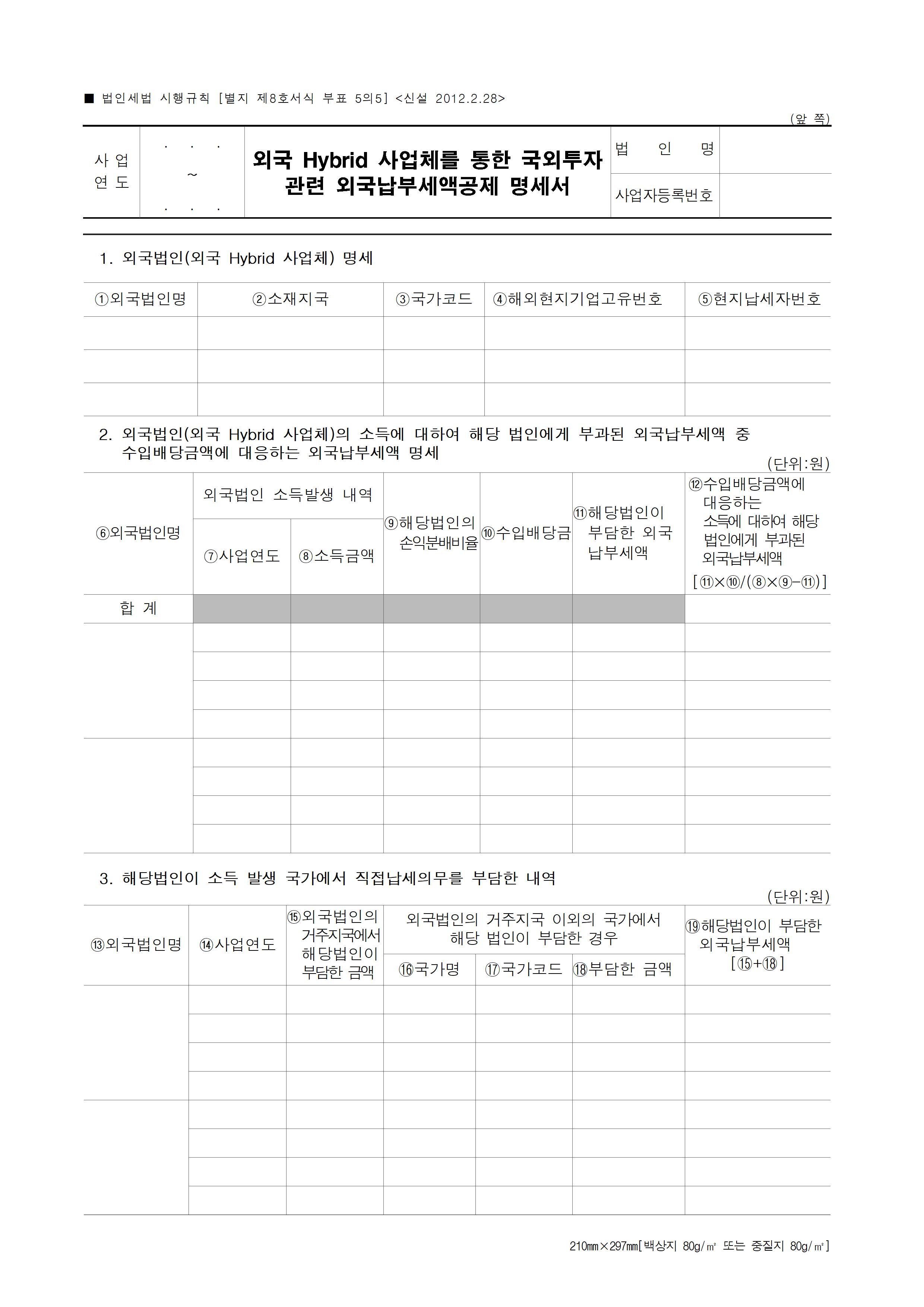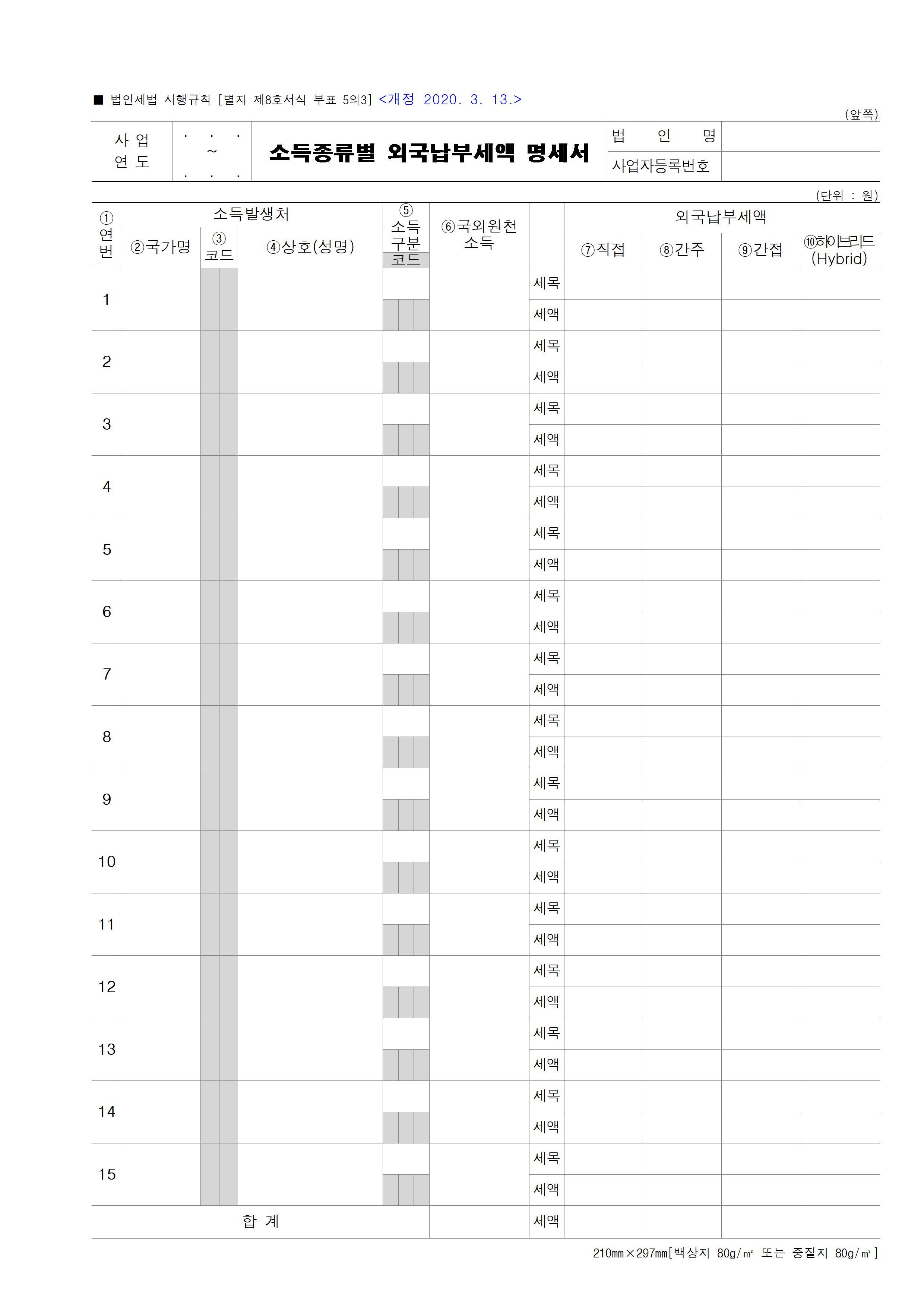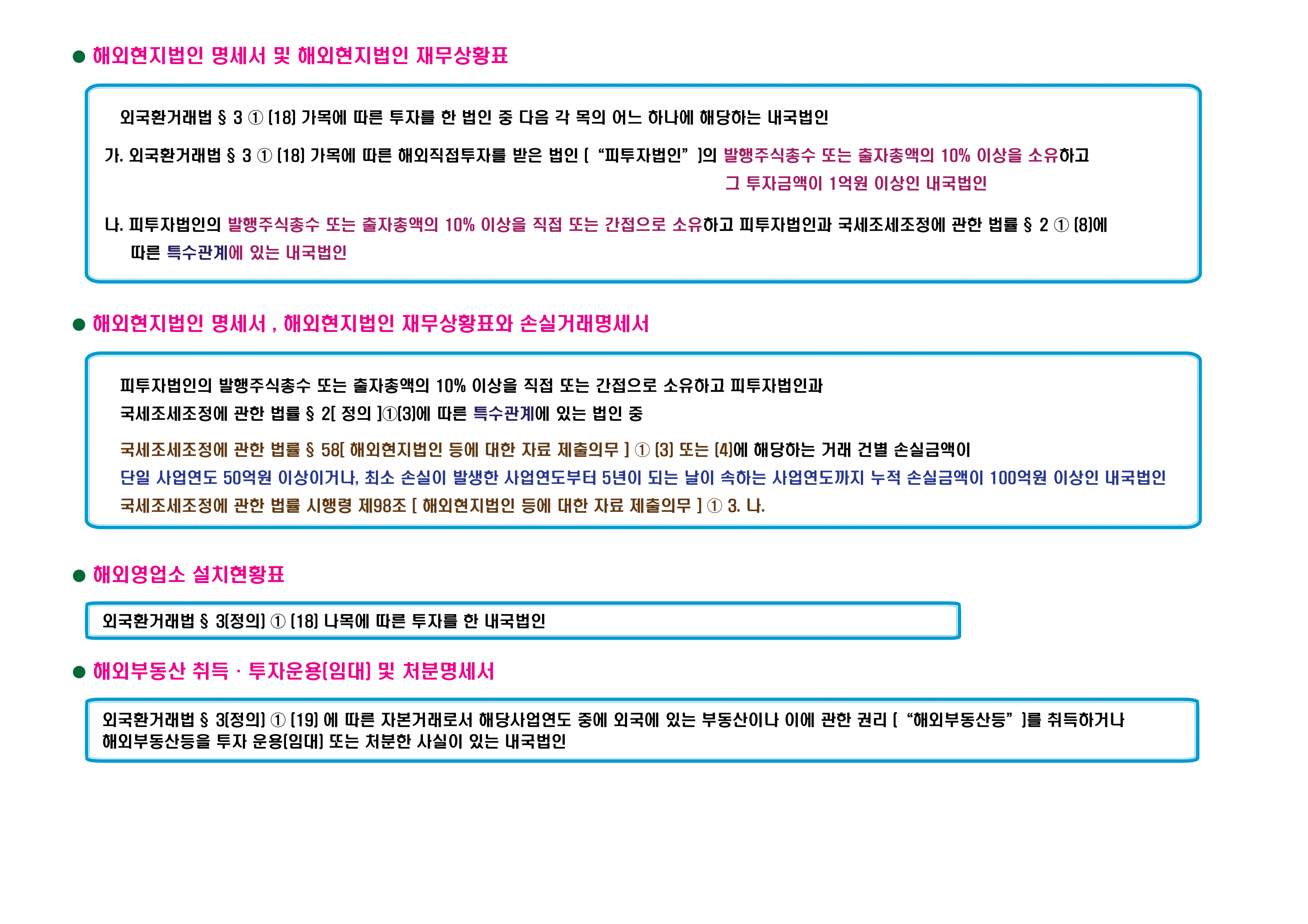 ④ 국제조세조정에관한법률시행규칙 별지 서식 작성자주황규|작성시간21.11.03|조회수330 목록 댓글 0 글자크기 작게가 글자크기 크게가 국제거래 (2021-11-03) 주황규.pdf711.10KB 국제조세조정에관한법률시행규칙 https://www.law.go.kr/%EB%B2%95%EB%A0%B9/%EA%B5%AD%EC%A0%9C%EC%A1%B0%EC%84%B8%EC%A1%B0%EC%A0%95%EC%97%90%EA%B4%80%ED%95%9C%EB%B2%95%EB%A5%A0%EC%8B%9C%ED%96%89%EA%B7%9C%EC%B9%99국제조세조정에관한법률시행규칙www.law.go.kr국제조세조정에관한법률시행규칙국제조세조정에관한법률시행규칙www.law.go.kr[별지 제47호서식] 해외현지법인 명세서(국제조세조정에 관한 법률 시행규칙).pdf88.03KB[별지 제48호서식] 해외현지법인 재무상황표(확정분¸ 가결산)(국제조세조정에 관한 법률 시행규칙).pdf73.92KB[별지 제49호서식] 손실거래명세서(국제조세조정에 관한 법률 시행규칙).pdf73.83KB[별지 제50호서식] 해외영업소 설치현황표(국제조세조정에 관한 법률 시행규칙).pdf70.67KB[별지 제51호서식] 해외부동산 취득ㆍ투자운용(임대) 및 처분 명세서(국제조세조정에 관한 법률 시행규칙).pdf75.82KB[별지 제52호서식] 취득자금 소명대상 금액의 출처 확인서(국제조세조정에 관한 법률 시행규칙).pdf78.59KB 외국기업본점등의 공통경비배분계산서.pdf168.05KB [별지 제16호서식] 국제거래명세서¸ 지급보증 용역거래 명세서(국제조세조정에 관한 법률 시행규칙).pdf101.67KB [별지 제17호서식] 국외특수관계인의 요약손익계산서(국제조세조정에 관한 법률 시행규칙).pdf70.45KB[별지 제26호서식] 국외특수관계인에게 지급하는 순이자비용에 대한 조정 명세서(갑¸ 을)(국제조세조정에 관한 법률 시행규칙).pdf61.93KB[별지 제30호서식] 특정외국법인의 유보소득계산 명세서(갑¸ 을)(국제조세조정에 관한 법률 시행규칙).pdf92.06KB [별지 제20호서식] 정상가격 산출방법 신고서(국제조세조정에 관한 법률 시행규칙).pdf63.95KB[별지 제19호서식] 무형자산에 대한 정상가격 산출방법 신고서(국제조세조정에 관한 법률 시행규칙).pdf74.45KB[별지 제18호서식] 용역거래에 대한 정상가격 산출방법 신고서(국제조세조정에 관한 법률 시행규칙).pdf75.82KB[별지 제1호서식] 거래가격 조정신고서(국제조세조정에 관한 법률 시행규칙).pdf56.61KB[별지 제33호서식] 국외 출자 명세서(국제조세조정에 관한 법률 시행규칙).pdf55.58KB[별지 제24호서식] 국외지배주주에게 지급하는 이자등에 대한 조정 명세서(갑¸ 을¸ 병¸ 정)(국제조세조정에 관한 법률 시행규칙).pdf98.87KB[별지 제25호서식] 국외지배주주에 대한 원천징수세액 조정 명세서(국제조세조정에 관한 법률 시행규칙).pdf43.20KB[별지 제31호서식] 특정외국법인의 유보소득 합산과세 판정 명세서(갑¸ 을¸ 병)(국제조세조정에 관한 법률 시행규칙).pdf107.65KB[별지 제32호서식] 특정외국법인의 유보소득 합산과세 적용범위 판정 명세서(갑¸ 을)(국제조세조정에 관한 법률 시행규칙).pdf92.54KB[별지 제51호서식] 해외부동산 취득ㆍ투자운용(임대) 및 처분 명세서(국제조세조정에 관한 법률 시행규칙).pdf75.82KB[별지 제27호서식] 혼성금융상품 관련 이자비용에 대한 조정 명세서(국제조세조정에 관한 법률 시행규칙).pdf59.04KB[별지 제20호 서식] 외국인 투자제한업종 경영상황보고서.pdf39.09KB[별지 제8호서식] 공제감면세액 및 추가납부세액합계표(갑¸ 을)¸ 공제감면세액계산서¸ 세액공제조정명세서¸ 국가별 외국납부세액공제 명세서¸ 소득종류별 외국납부세액 명세서¸ 간접외국납(법인세법 시행규칙).pdf384.33KB[별지 제8호서식] 공제감면세액 및 추가납부세액합계표(갑¸ 을)¸ 공제감면세액계산서¸ 세액공제조정명세서¸ 국가별 외국납부세액공제 명세서¸ 소득종류별 외국납부세액 명세서¸ 간접외국납(법인세법 시행규칙).hwp272.50KB 첨부파일첨부된 파일이 66개 있습니다. pdf 파일 [별지 제47호서식] 해외현지법인 명세서(국제조세조정에 관한 법률 시행규칙).pdf 다운로드 pdf 파일 [별지 제48호서식] 해외현지법인 재무상황표(확정분¸ 가결산)(국제조세조정에 관한 법률 시행규칙).pdf 다운로드 pdf 파일 [별지 제49호서식] 손실거래명세서(국제조세조정에 관한 법률 시행규칙).pdf 다운로드 pdf 파일 [별지 제50호서식] 해외영업소 설치현황표(국제조세조정에 관한 법률 시행규칙).pdf 다운로드 pdf 파일 [별지 제51호서식] 해외부동산 취득ㆍ투자운용(임대) 및 처분 명세서(국제조세조정에 관한 법률 시행규칙).pdf 다운로드 pdf 파일 [별지 제52호서식] 취득자금 소명대상 금액의 출처 확인서(국제조세조정에 관한 법률 시행규칙).pdf 다운로드 jpg 파일 외국기업본점등의 공통경비배분계산서.jpg 다운로드 pdf 파일 외국기업본점등의 공통경비배분계산서.pdf 다운로드 pdf 파일 [별지 제16호서식] 국제거래명세서¸ 지급보증 용역거래 명세서(국제조세조정에 관한 법률 시행규칙).pdf 다운로드 pdf 파일 [별지 제17호서식] 국외특수관계인의 요약손익계산서(국제조세조정에 관한 법률 시행규칙).pdf 다운로드 pdf 파일 [별지 제26호서식] 국외특수관계인에게 지급하는 순이자비용에 대한 조정 명세서(갑¸ 을)(국제조세조정에 관한 법률 시행규칙).pdf 다운로드 pdf 파일 [별지 제30호서식] 특정외국법인의 유보소득계산 명세서(