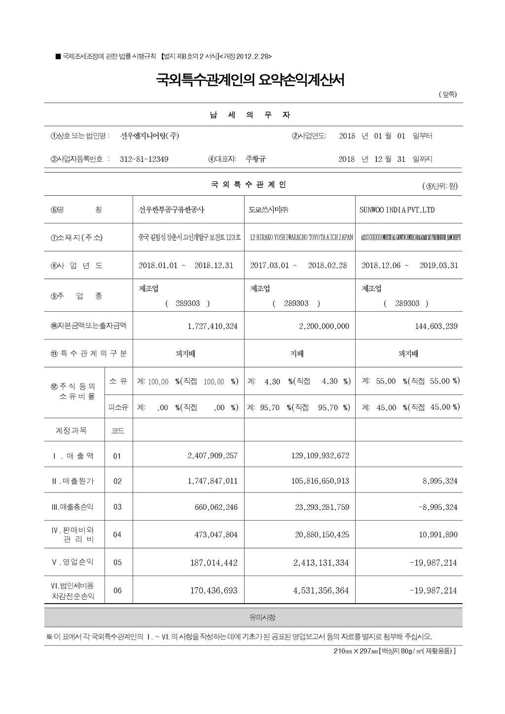 3 - 국외특수관계인의 요약손익계산서 작성자Jayden Ju.|작성시간19.07.30|조회수146 목록 댓글 0 글자크기 작게가 글자크기 크게가 국외특수관계인 요약손익계산서.pdf 첨부파일첨부된 파일이 2개 있습니다. jpg 파일 국외특수관계인 요약손익계산서.jpg 다운로드 pdf 파일 국외특수관계인 요약손익계산서.pdf 다운로드 다음검색 현재 게시글 추가 기능 열기 북마크 공유하기 신고 센터로 신고 댓글 댓글 0 댓글쓰기 답글쓰기 댓글 리스트