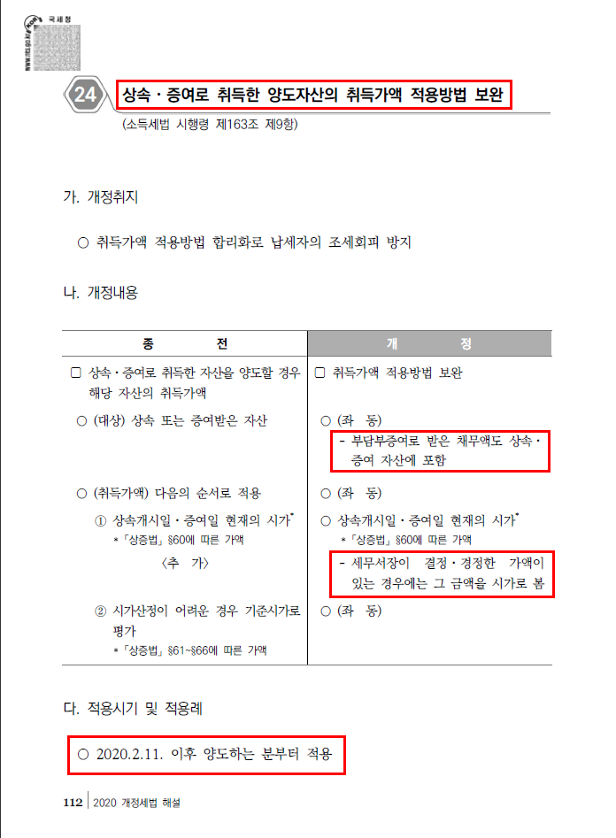 소득세법시행령 제159조 [ 부담부증여에 대한 양도차익의 계산 ] - 부담부증여로 받은 채무액도 상속 증여 자산에 포함 2020.2.11. 이후 양도하는 분부터 적용