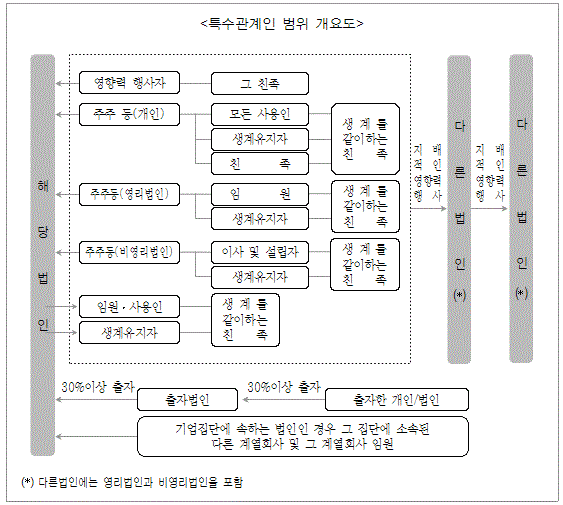 나. 본인이 법인인 경우: 본인이 속한 기획재정부령으로 정하는 기업집단의 소속 기업(해당 기업의 임원과 퇴직임원을 포함한다)과 해당 기업의 임원에 대한 임면권의 행사 및 사업방침의 결정 등을 통하여 그 경영에 관하여 사실상의 영향력을 행사하고 있는 자 및 그와 제1호에 해당하는 관계에 있는 자(2019.02.12 개정)
