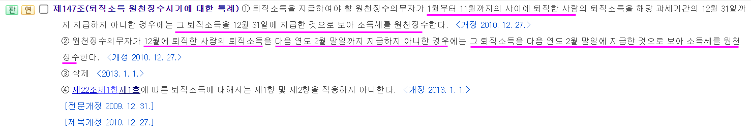소득세법 제147조 [ 퇴직소득 원천징수시기에 대한 특례(2010.12.27 제목개정) ]