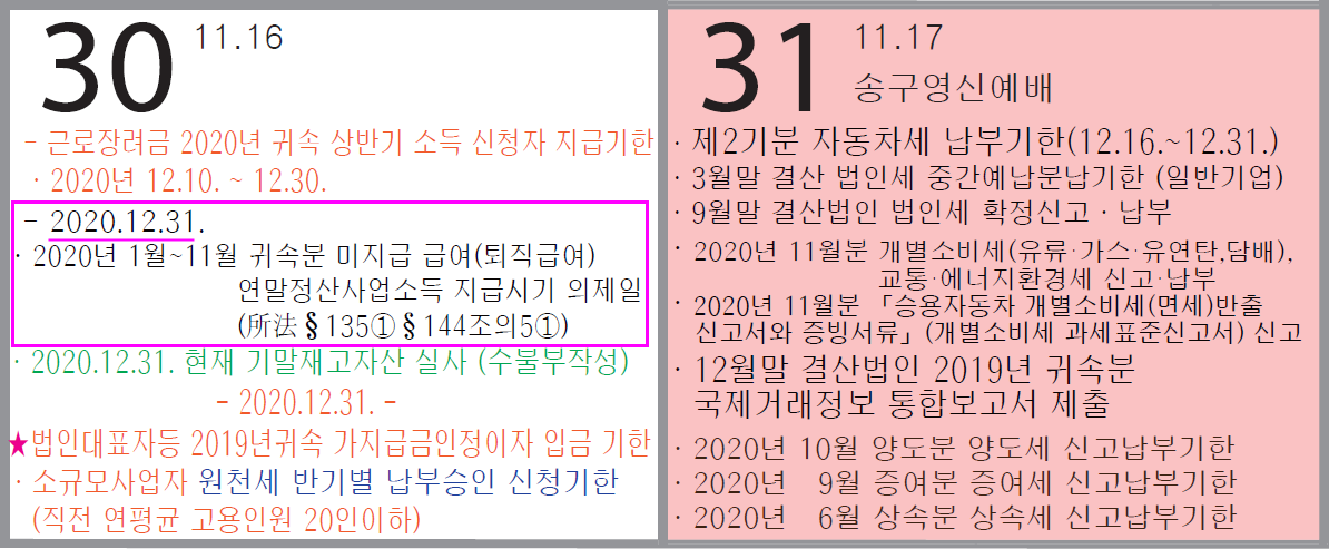 12.31. : 1월~11월 귀속분 미지급 급여 (퇴직급여) , 연말정산 사업소득 지급시기 의제일 (所法 §135 ① § 144조의5 ①)