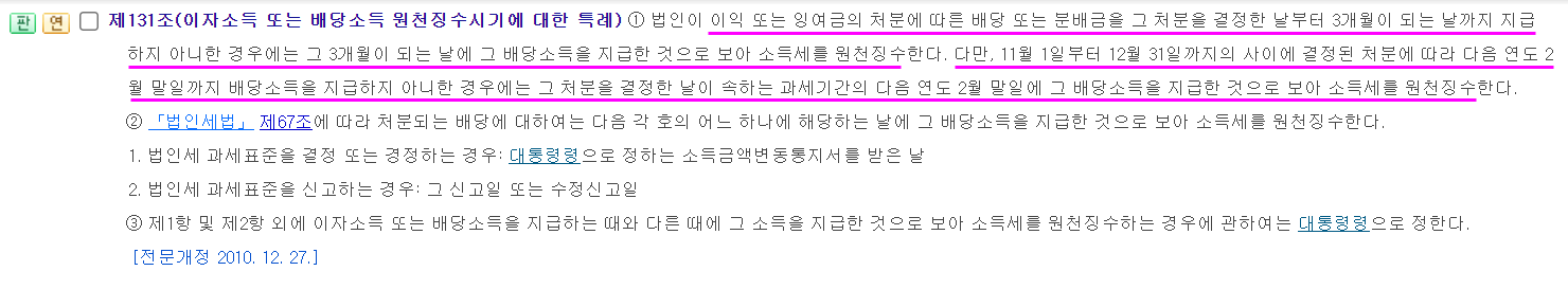 소득세법 제131조 [ 이자소득 또는 배당소득 원천징수시기에 대한 특례(2010.12.27 제목개정) ]