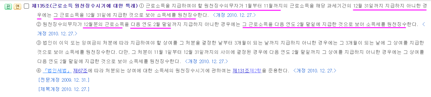 소득세법 제135조 [ 근로소득 원천징수시기에 대한 특례(2010.12.27 제목개정) ]