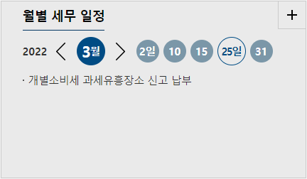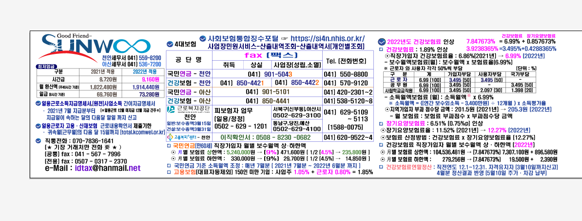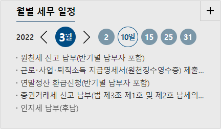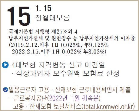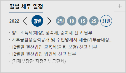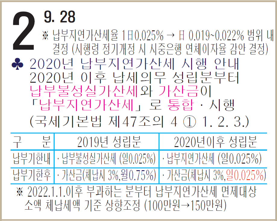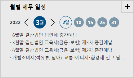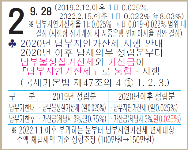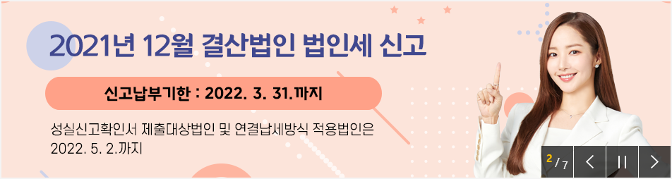 2022년 세율표 및 세무달력 pdf 작성자주황규|작성시간22.02.11|조회수363 목록 댓글 0 글자크기 작게가 글자크기 크게가 세무달력 (2021년 8월 ~ 2023년 01월) 선우회계법인 주황규.pdf4.74MB소기업 (별표 3) 주된 업종별 평균매출액등의 소기업 규모 기준.pdf49.72KB2022년 개정세법 요약 국세기본법 제5조(기한의특례) 규정에 따라 신고·납부 기한일이 공휴일·토요일 또는 근로자의 날 에 해당하는 때에는 공휴일·토요일 또는 근로자의 날의 다음날을 기한으로 합니다. 첨부파일첨부된 파일이 25개 있습니다. png 파일 납부지연가산세.png 다운로드 png 파일 최저임금.png 다운로드 png 파일 4대보험.png 다운로드 png 파일 가산금.png 다운로드 png 파일 납부지연가산세.png 다운로드 jpg 파일 주황규 팀장.jpg 다운로드 png 파일 세율.png 다운로드 png 파일 성실신고.png 다운로드 png 파일 공익법인.png 다운로드 png 파일 근로장려금.png 다운로드 png 파일 장려금.png 다운로드 png 파일 공인법인 감사.png 다운로드 png 파일 종교인 지급명세서.png 다운로드 png 파일 법인세신고.png 다운로드 png 파일 근로장려금.png 다운로드 png 파일 연구인력개발비.png 다운로드 png 파일 용역제공자.png 다운로드 png 파일 대리기사.png 다운로드 png 파일 0315.png 다운로드 png 파일 0302.png 다운로드 png 파일 0310.png 다운로드 png 파일 0325.png 다운로드 png 파일 0331.png 다운로드 pdf 파일 소기업 (별표 3) 주된 업종별 평균매출액등의 소기업 규모 기준.pdf 다운로드 pdf 파일 세무달력 (2021년 8월 ~ 2023년 01월) 선우회계법인 주황규.pdf 다운로드 다음검색 현재 게시글 추가 기능 열기 북마크 공유하기 신고 센터로 신고 댓글 댓글 0 댓글쓰기 답글쓰기 댓글 리스트