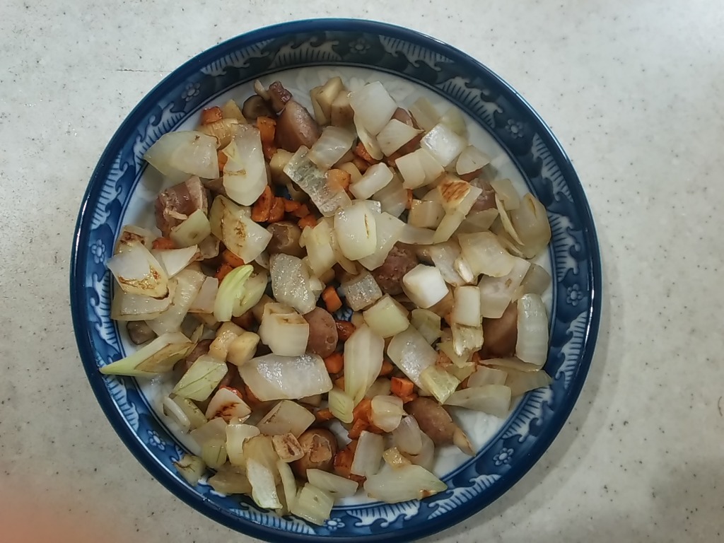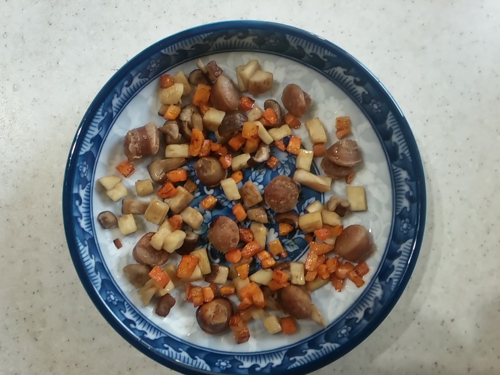그릇에 볶은 버섯과 소세지를 담고