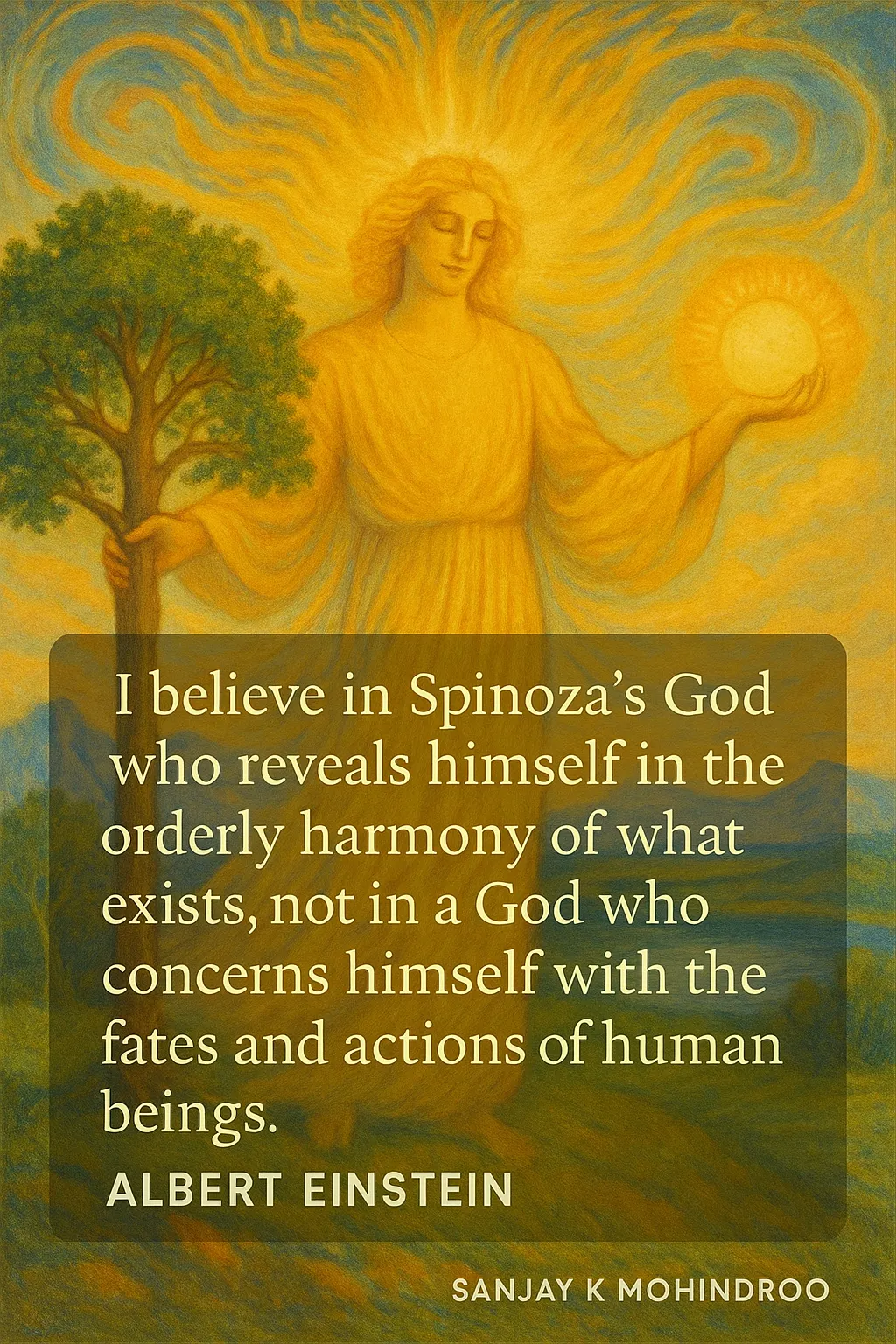 "스피노자의 신": 신은 창조주이자 인격적 존재가 아니라, 자연 그 자체(Deus sive Natura, 신 즉 자연)이며, 우주 만물에 내재된 질서와 법칙을 의미합니다.