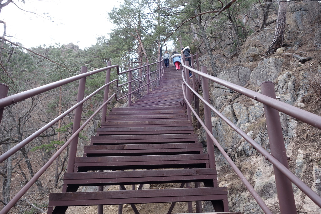 토왕성 폭포 오르는 길은 편도 410m로 900 여개의 급 경사 계단 길이다.