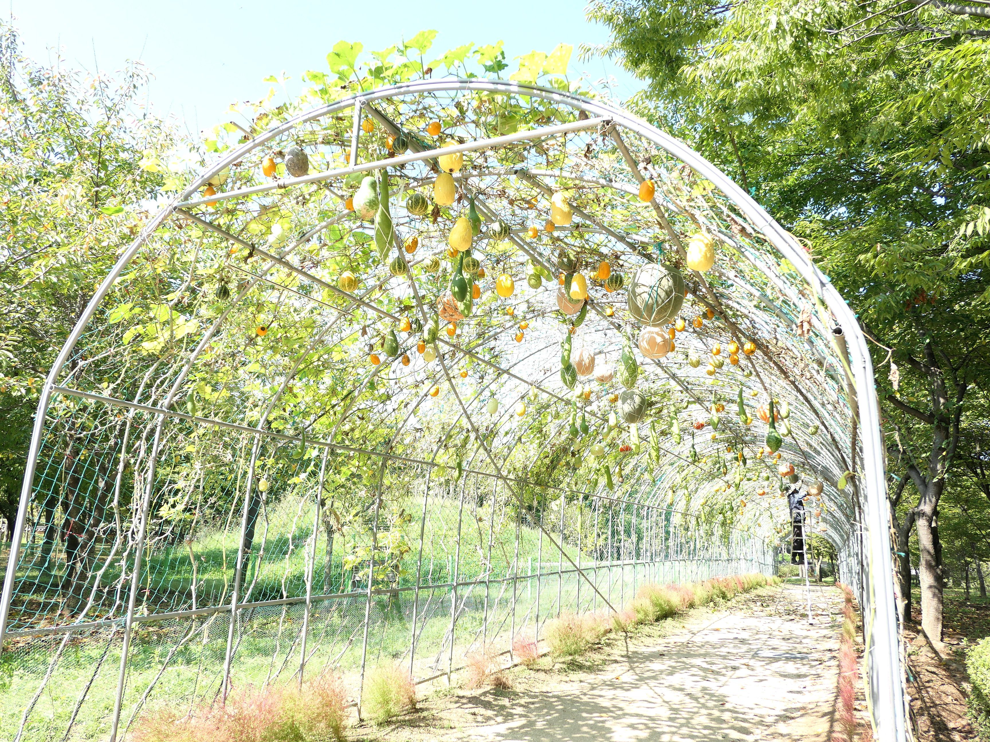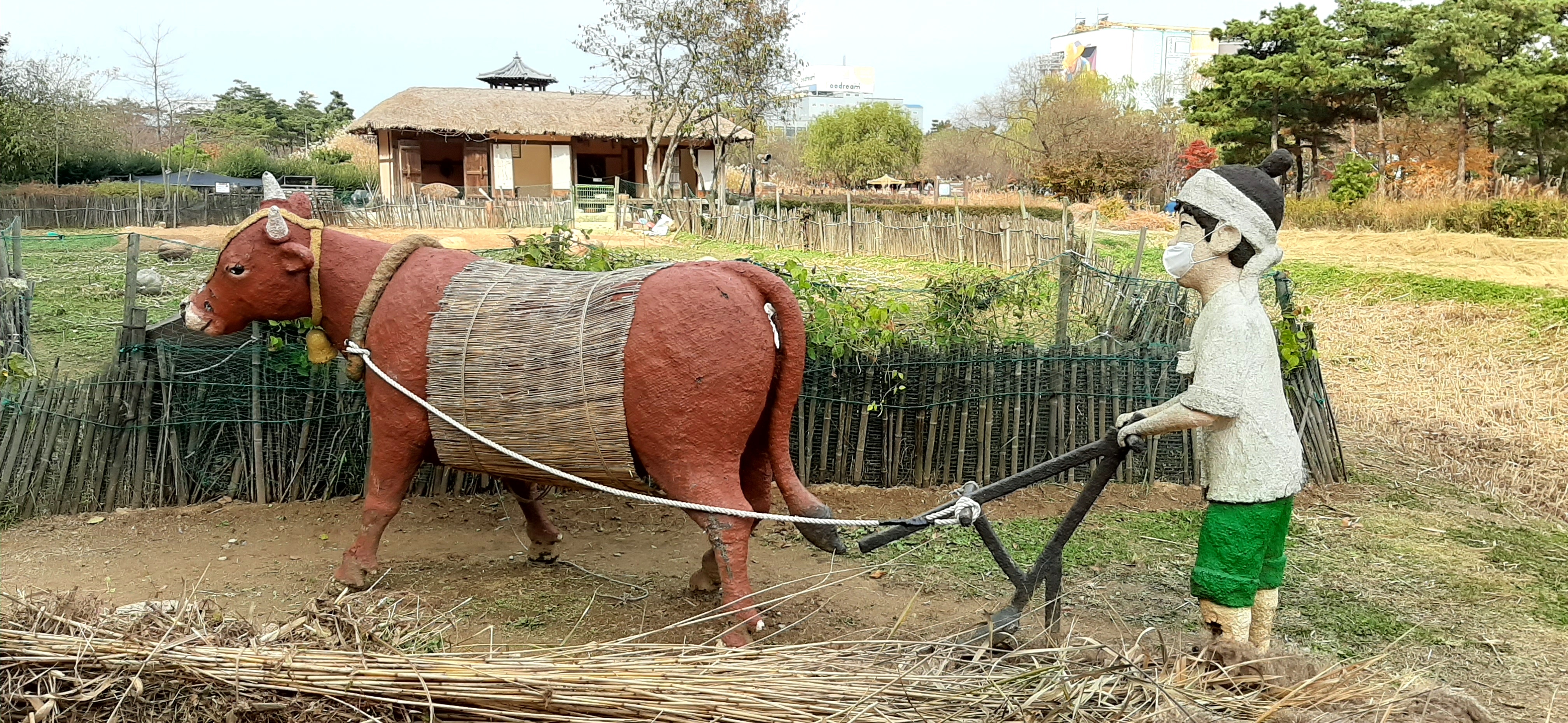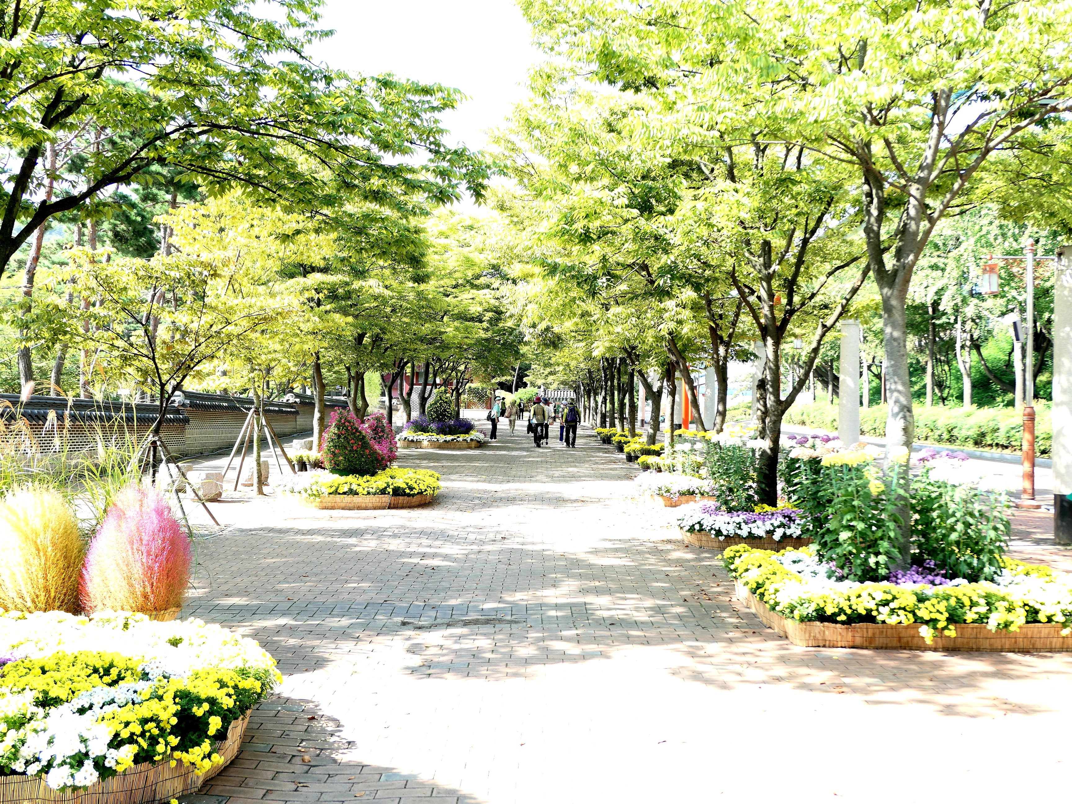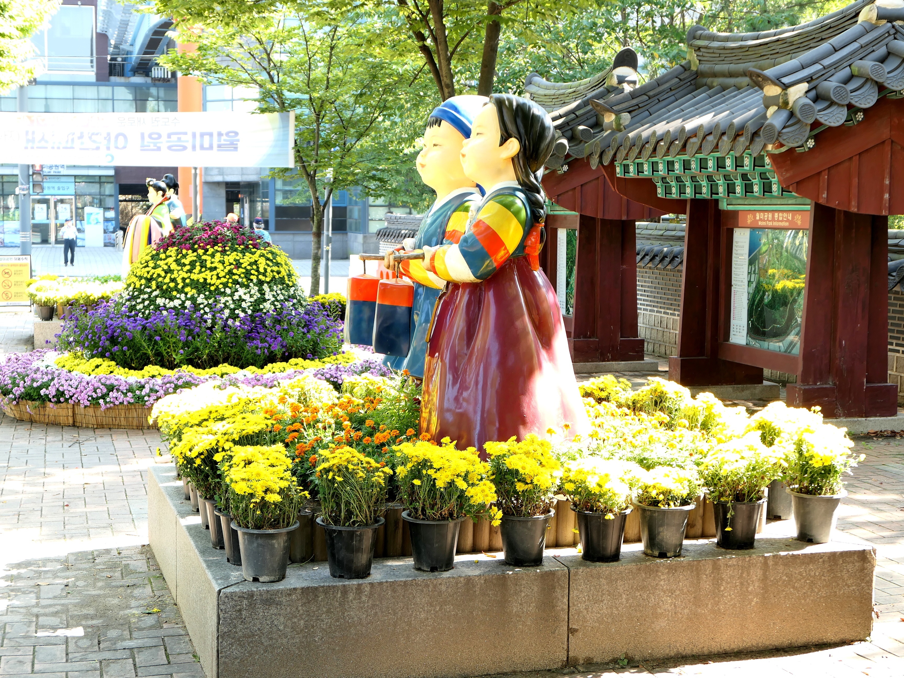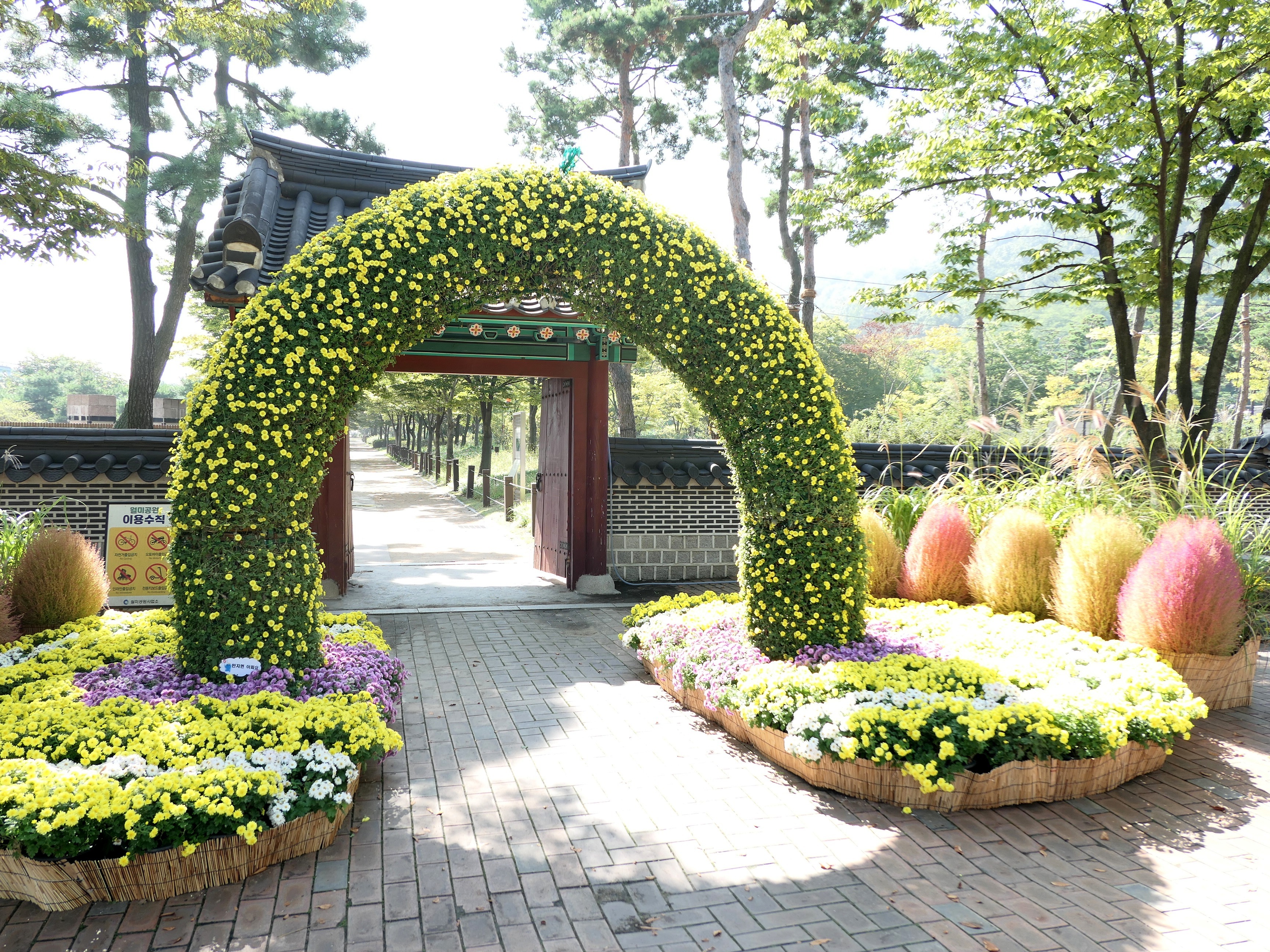 정문을 지나면 왼쪽이 한국전통정원이고 정원입구는 전통복장의 인형과 국화꽃으로 장식되어있다.