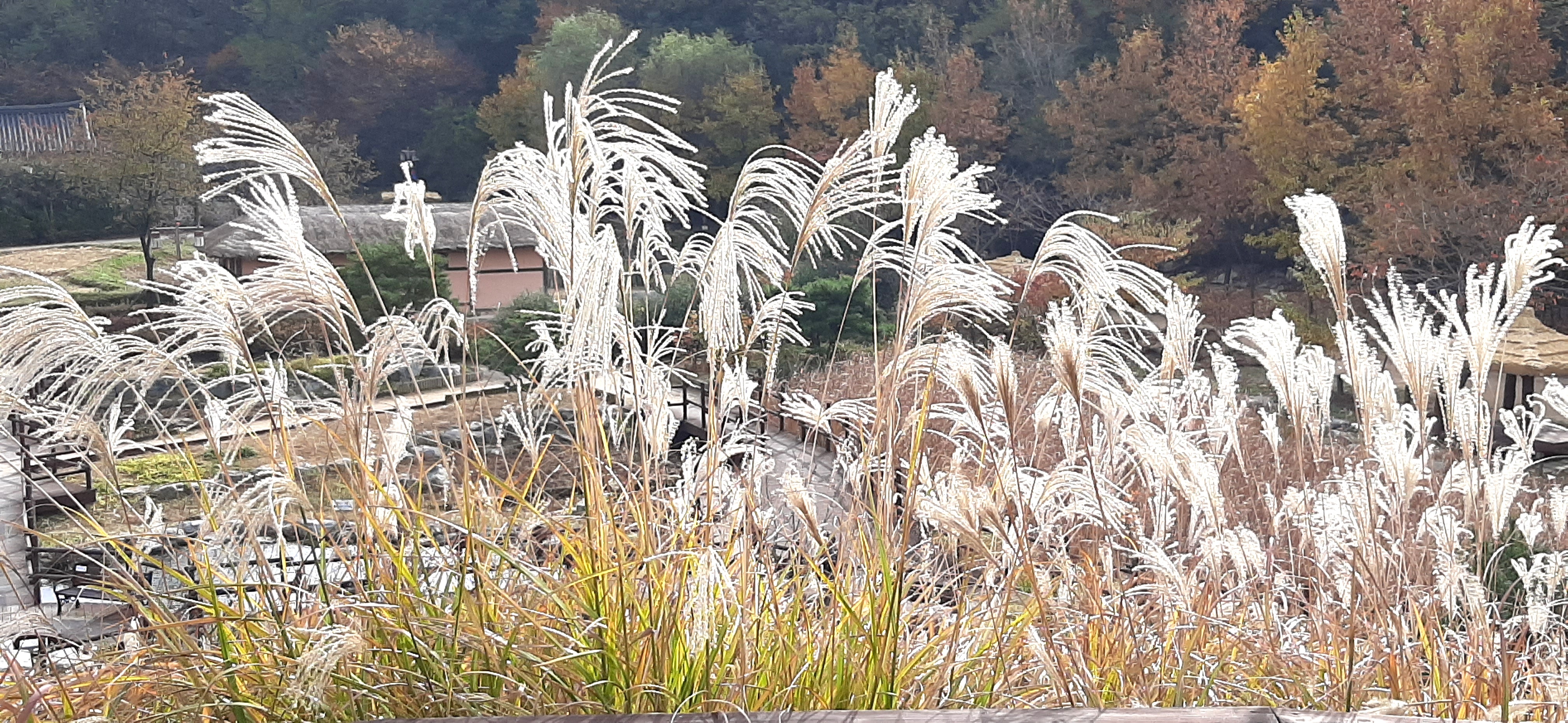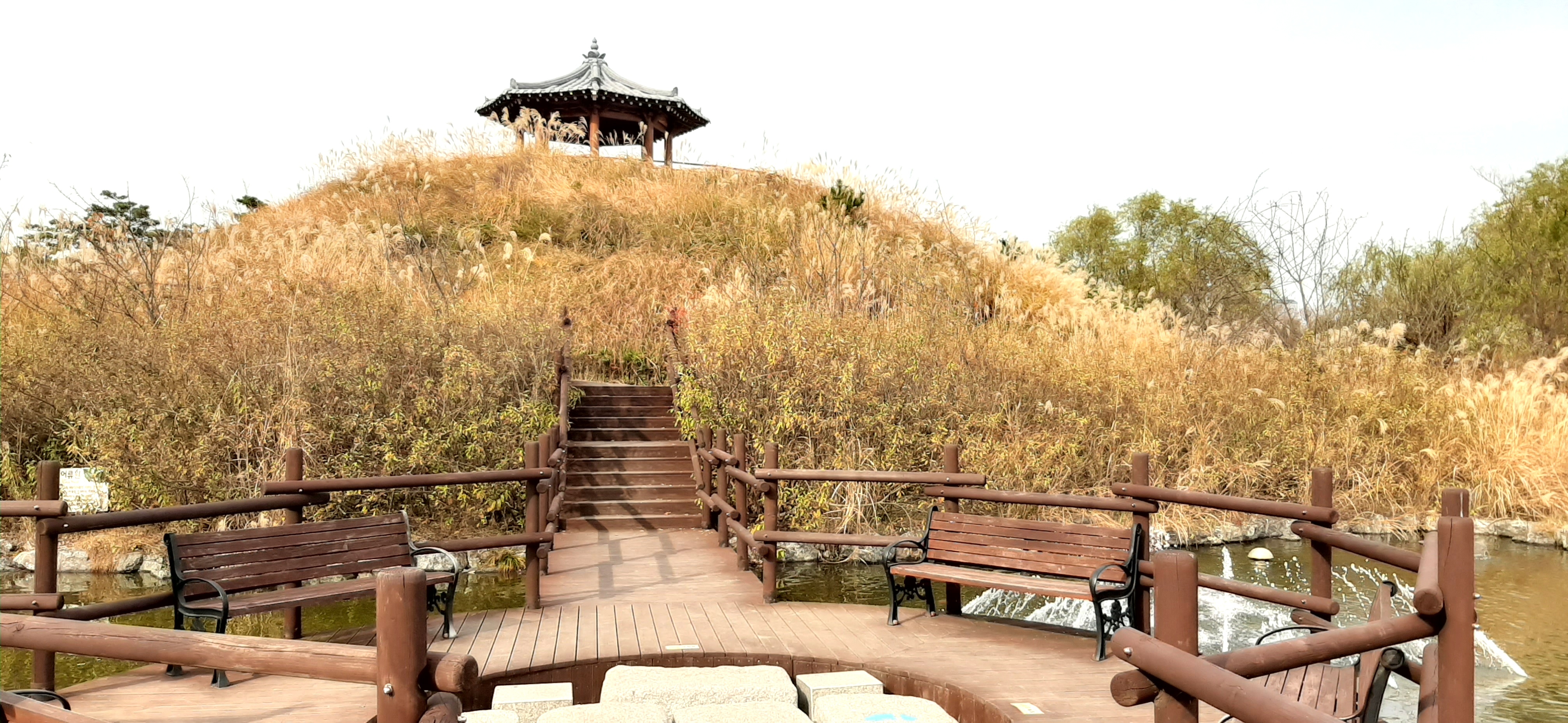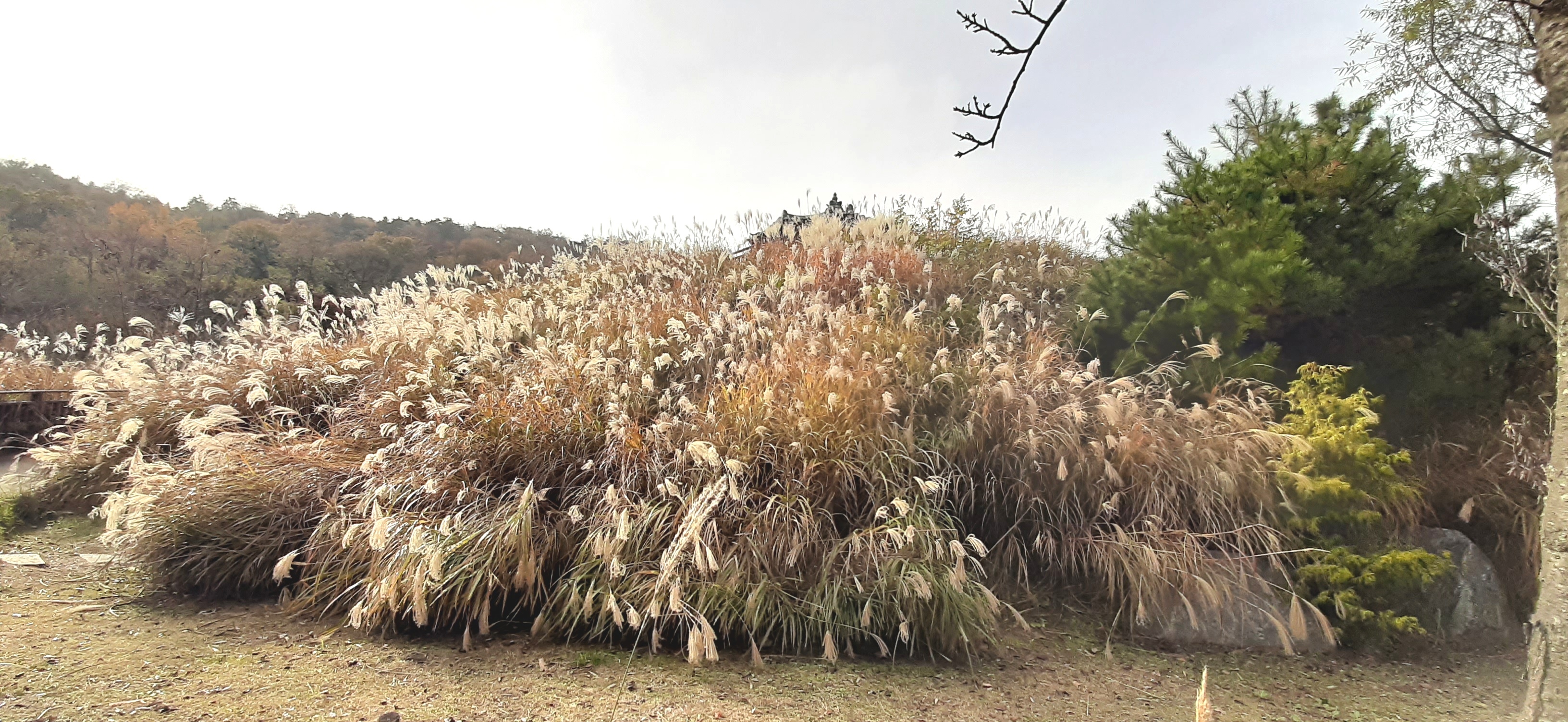 월휴정 언덕을 감싸고 있는 억새가 햇살을 받아 눈부시다.