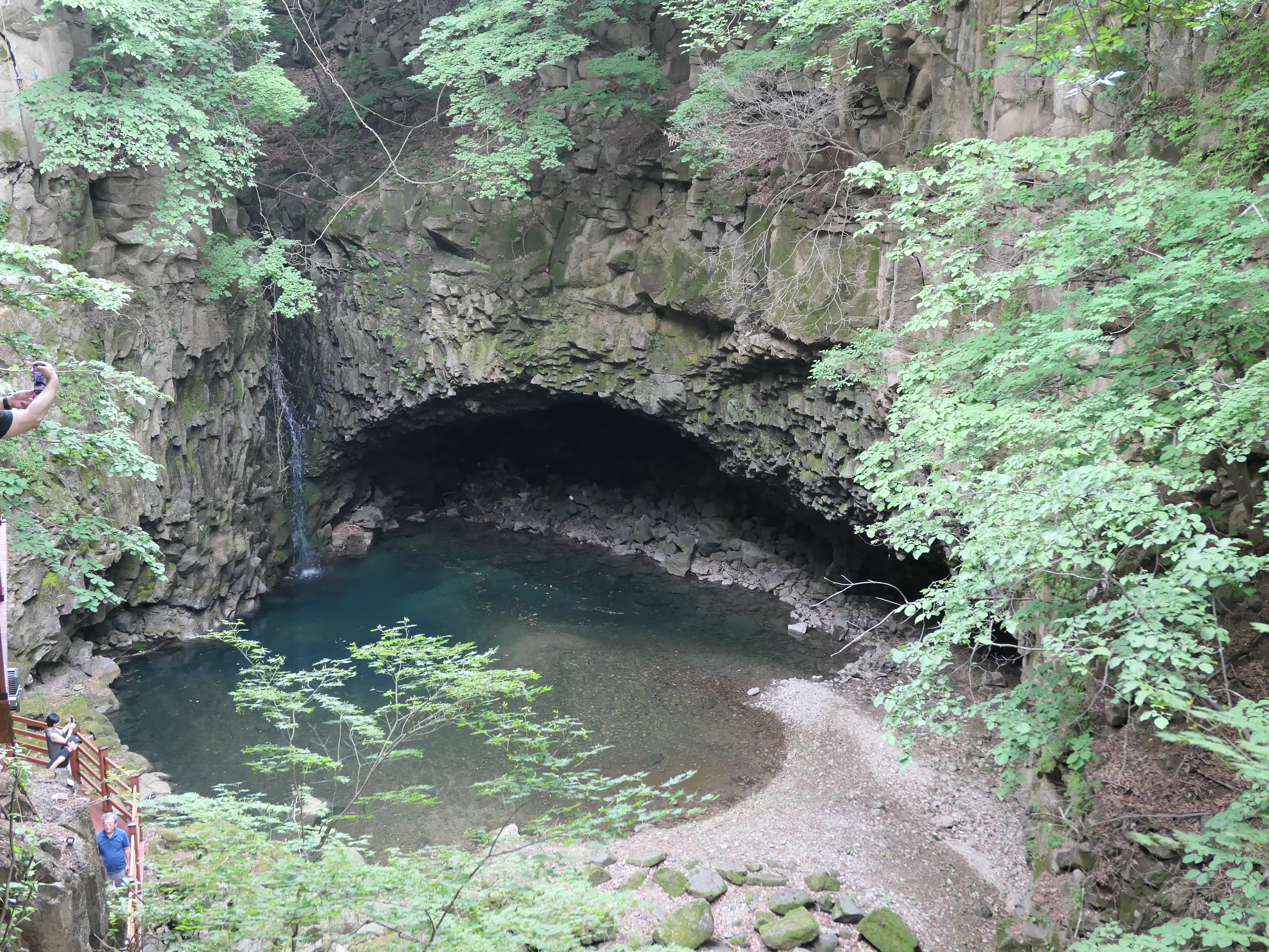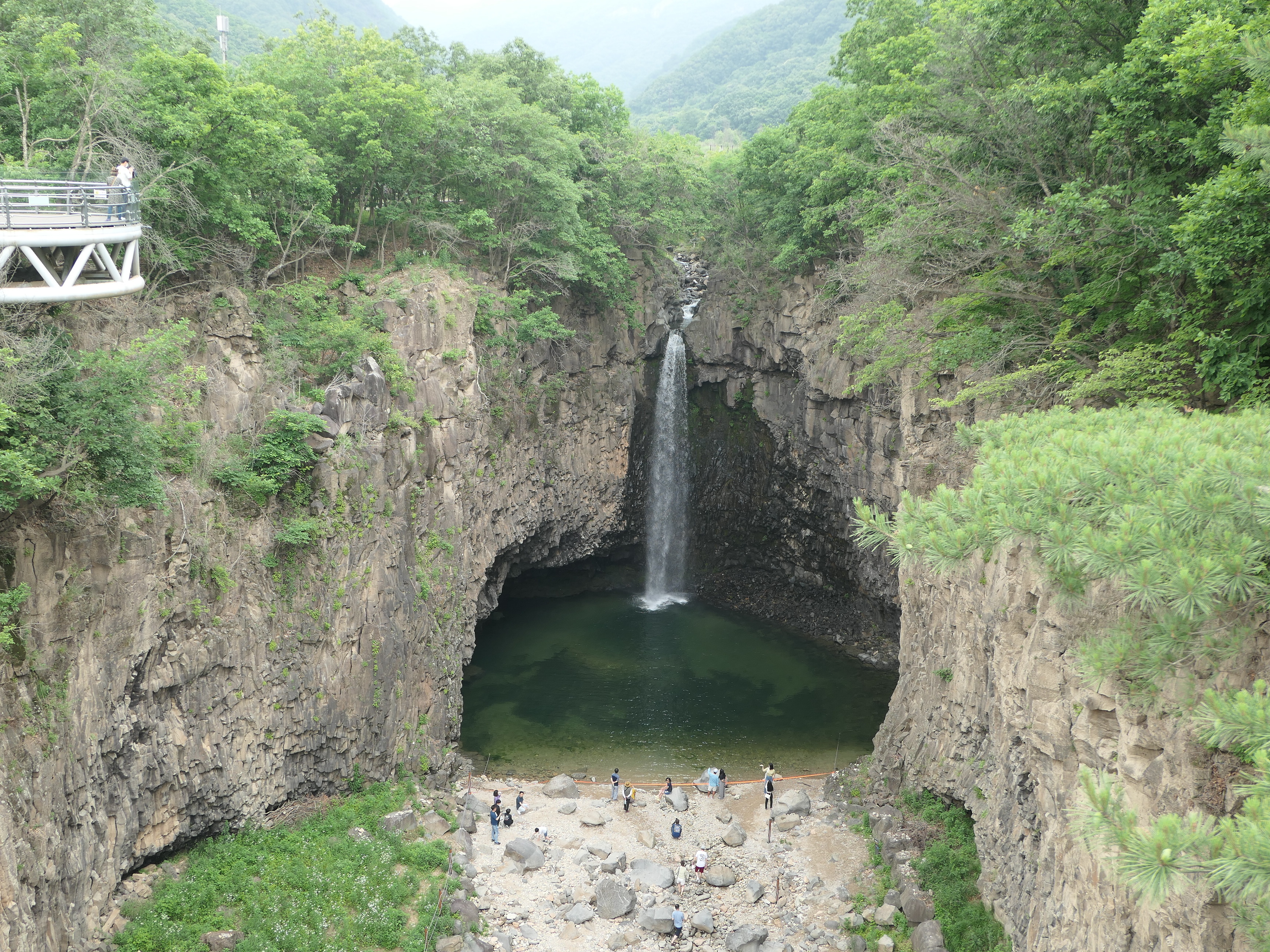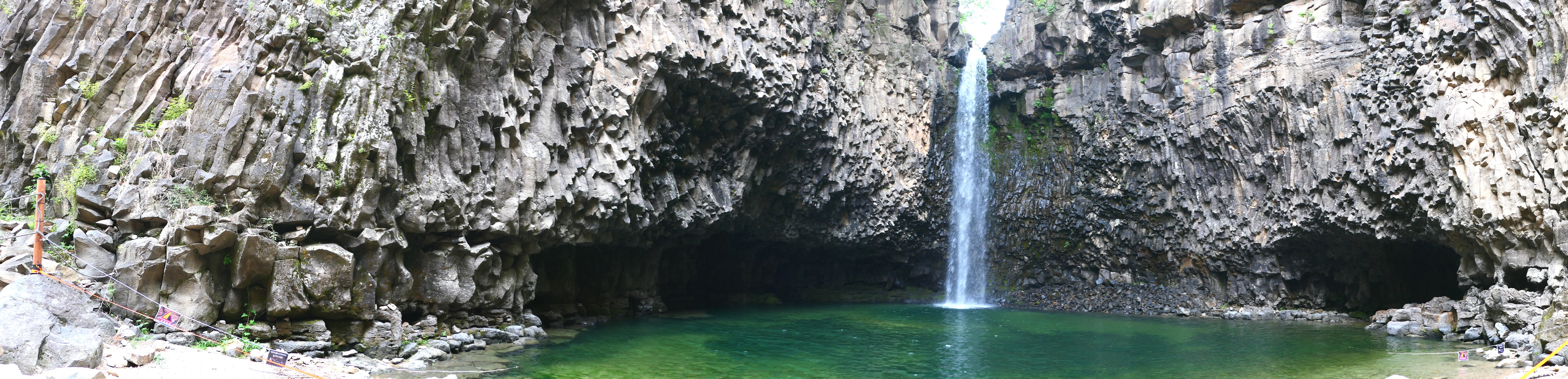 폭포 아래는 수심 5m의 포트홀이 만들어져 있고 하식동굴과 3차례에 걸친 용암 현무암층을 확인 할 수 있다.