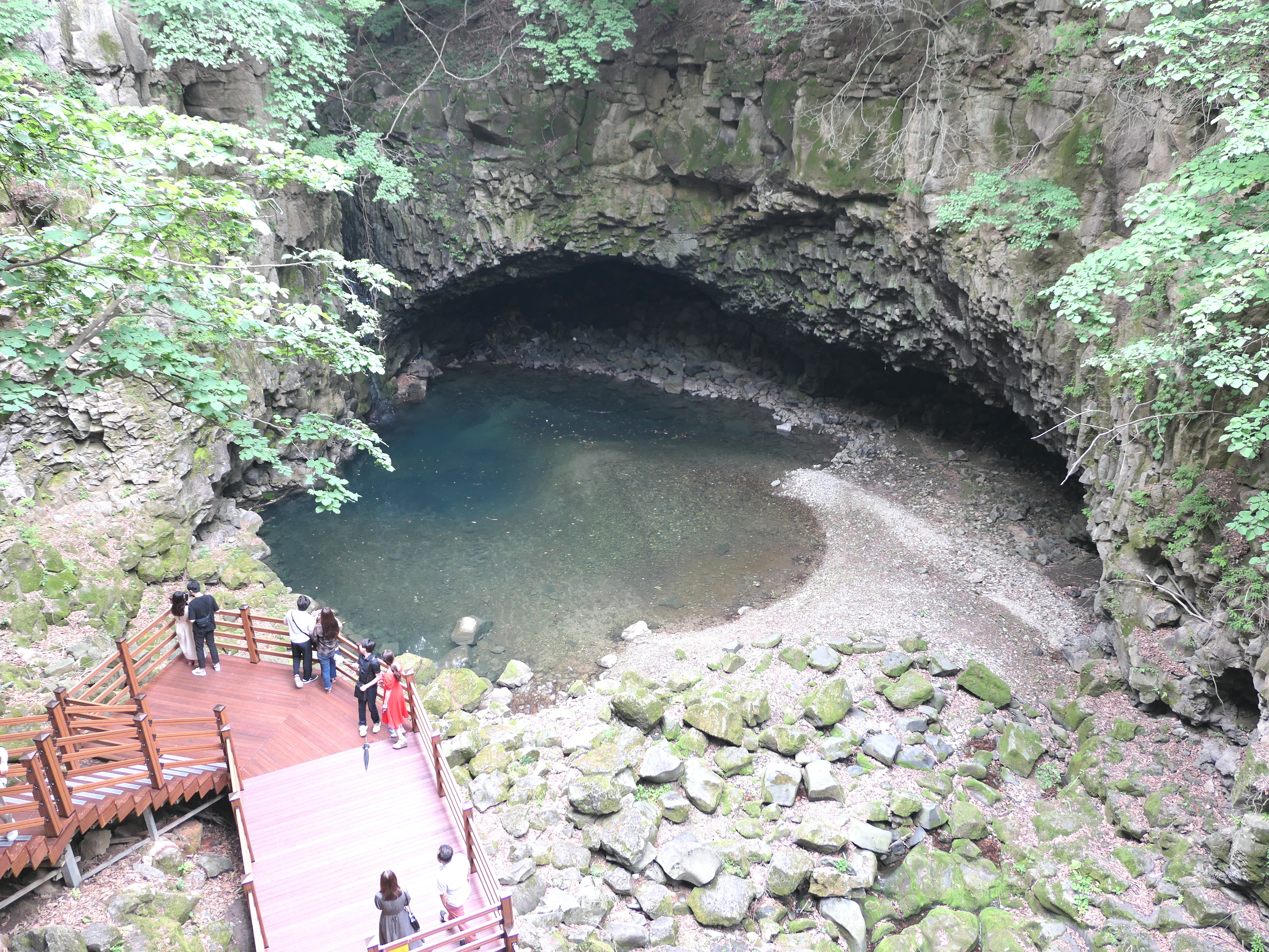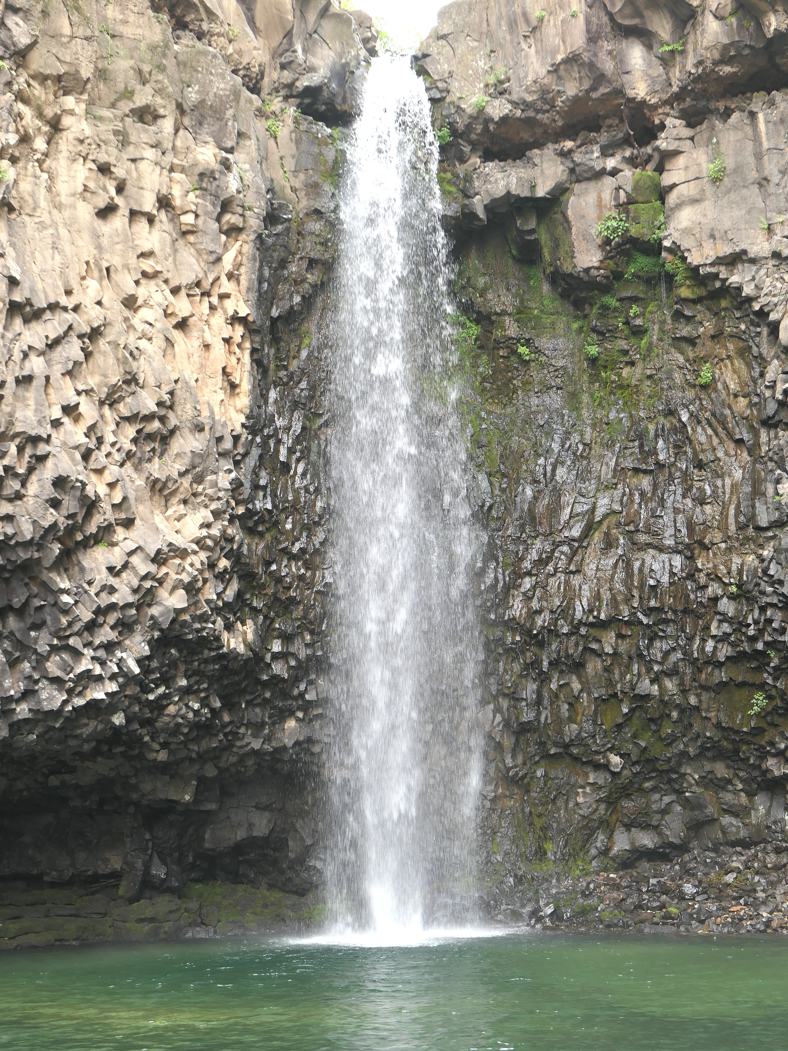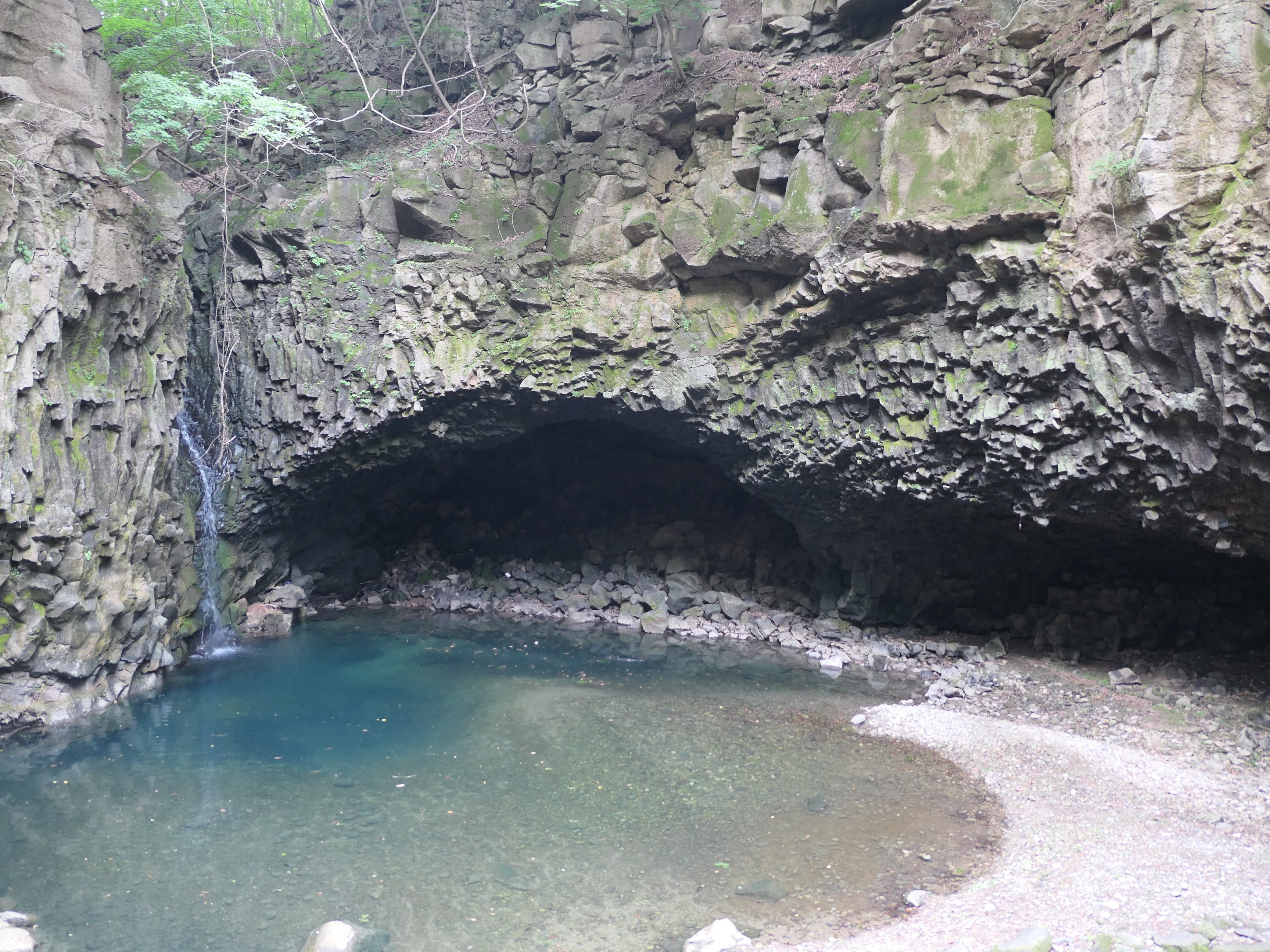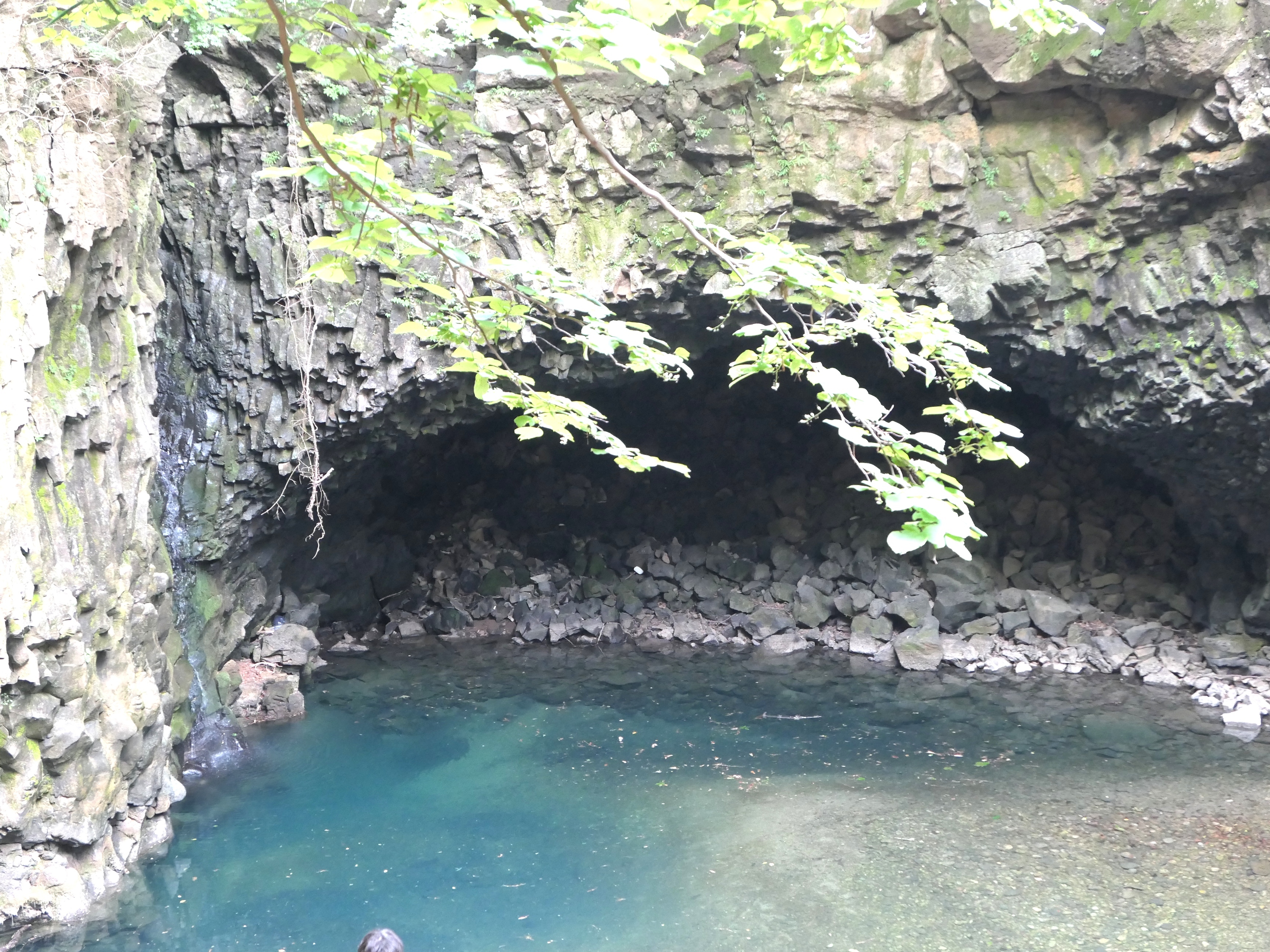 폭포 아래는 수심 5m의 포트홀이 만들어져 있고 하식동굴과 3차례에 걸친 용암 현무암층을 확인 할 수 있다.