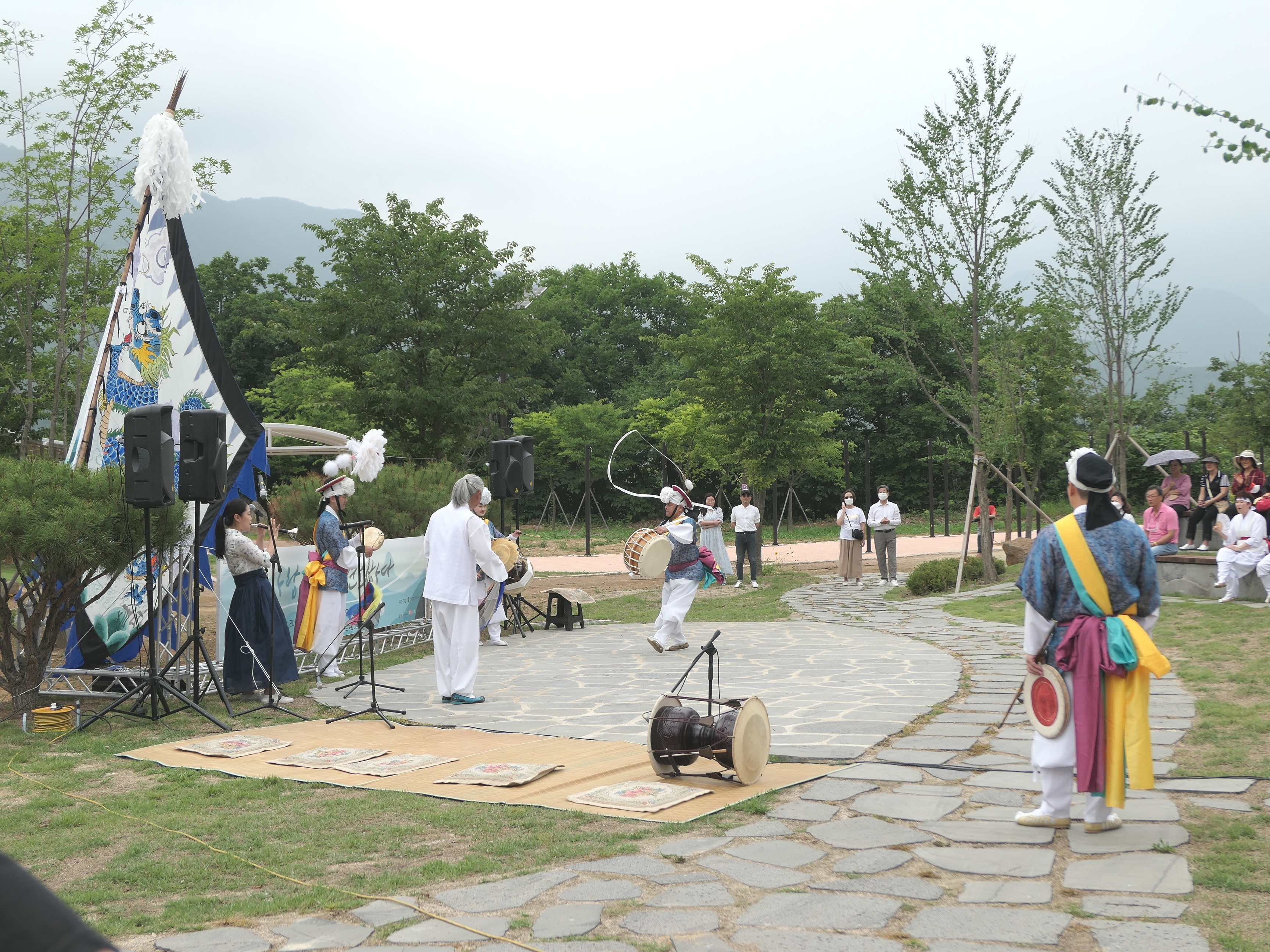 공원 공연장에서는 농악이 이어지고 있다.