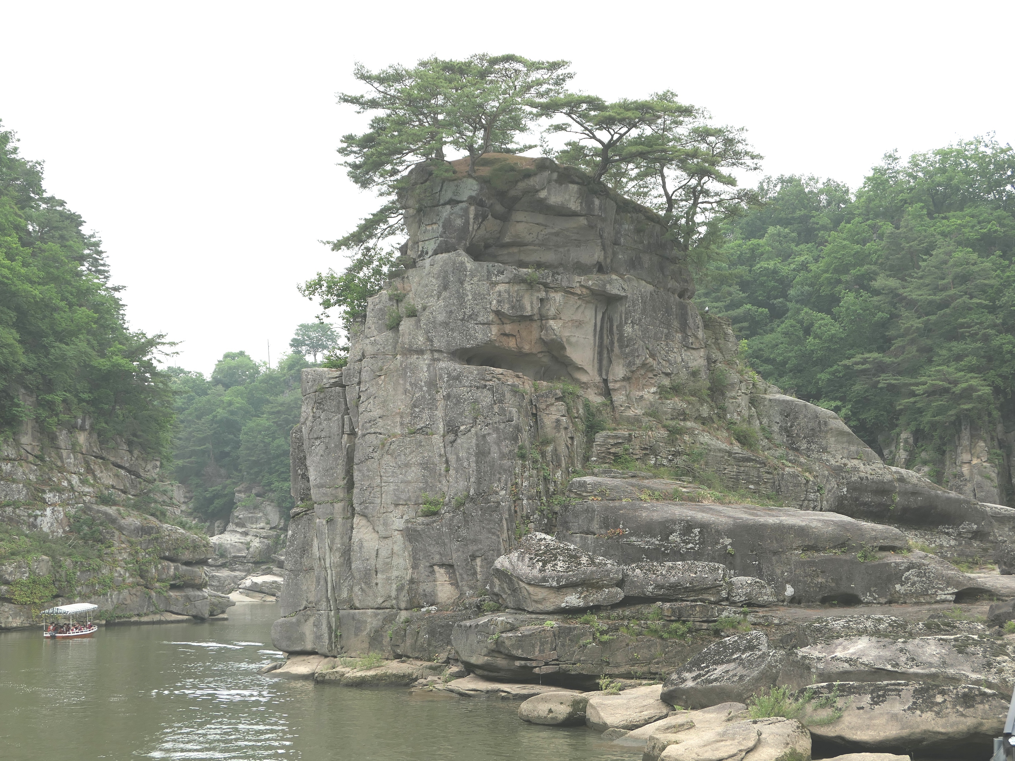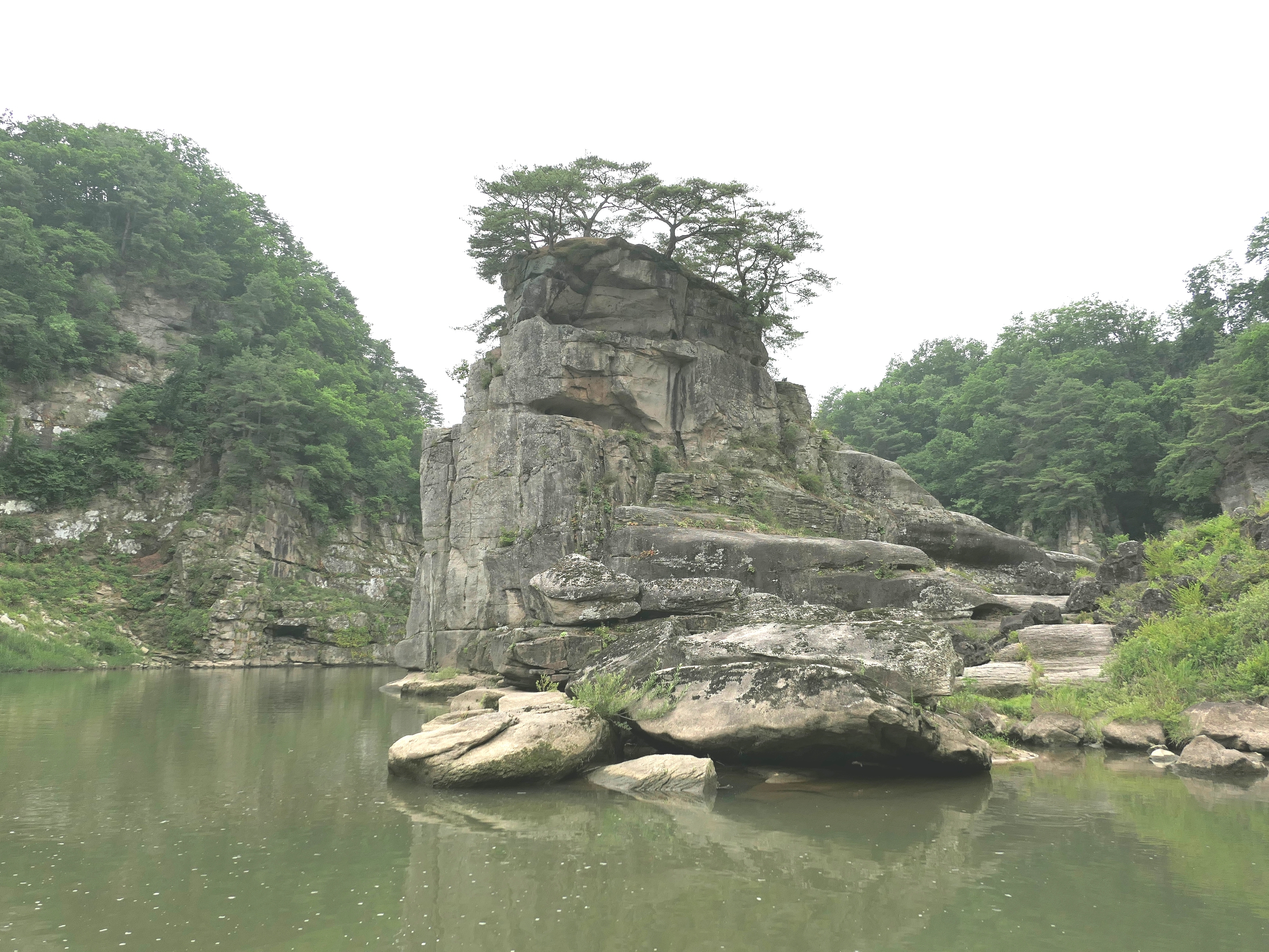 한탄강 가운데 15m 높이로 외롭게 솟이 있는 고석바위(강원도 기념물 8호)와 절벽 가운데 있는 정자를