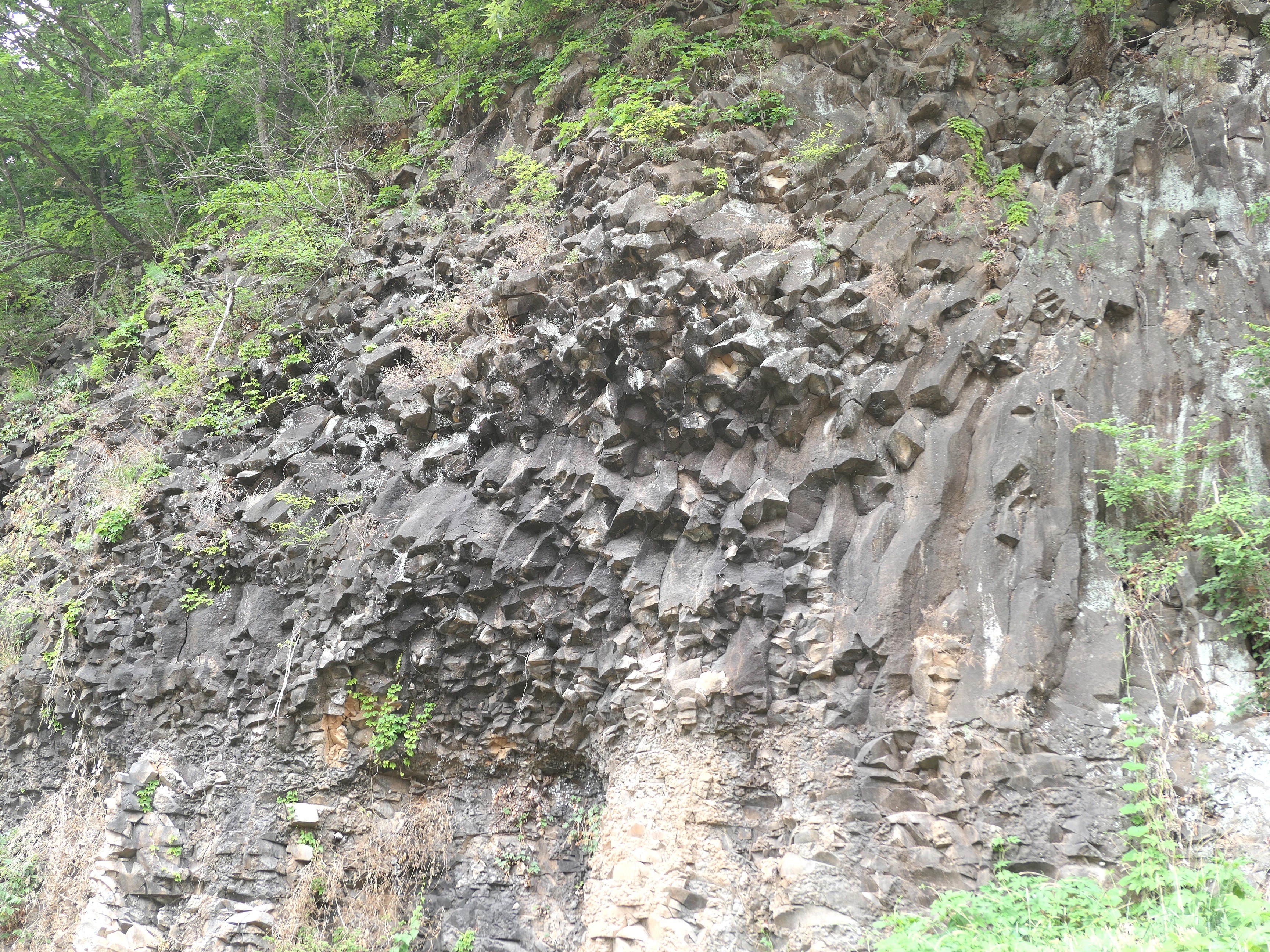 30m 높이의 현무암 주상절리 절벽 하단부분에 아직도 암석화가 되지 않은 퇴적층이 분포하는데
