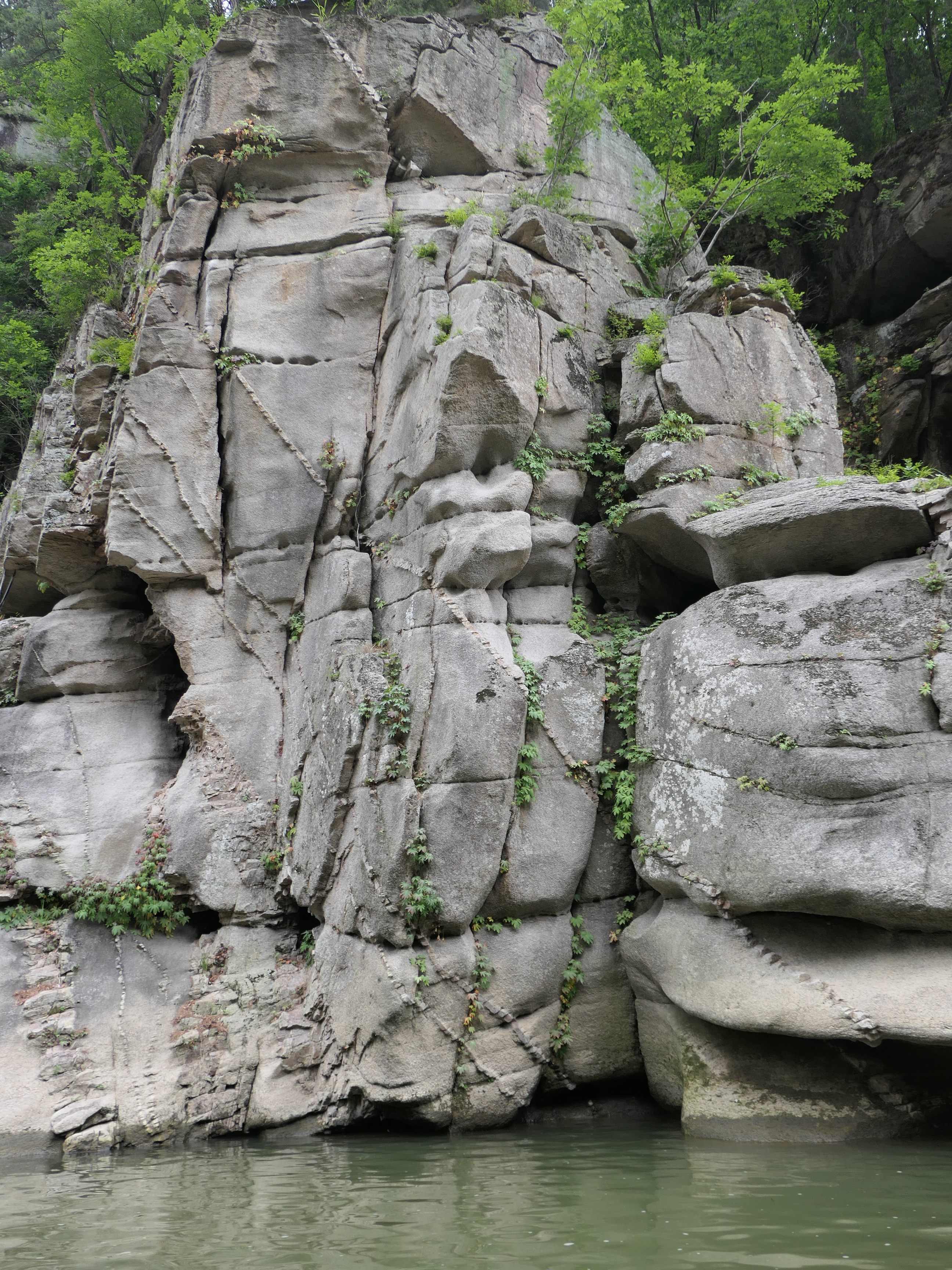 화강암 가로 세로 대각선 절리 사이로 돌단풍이 자라고 있다.