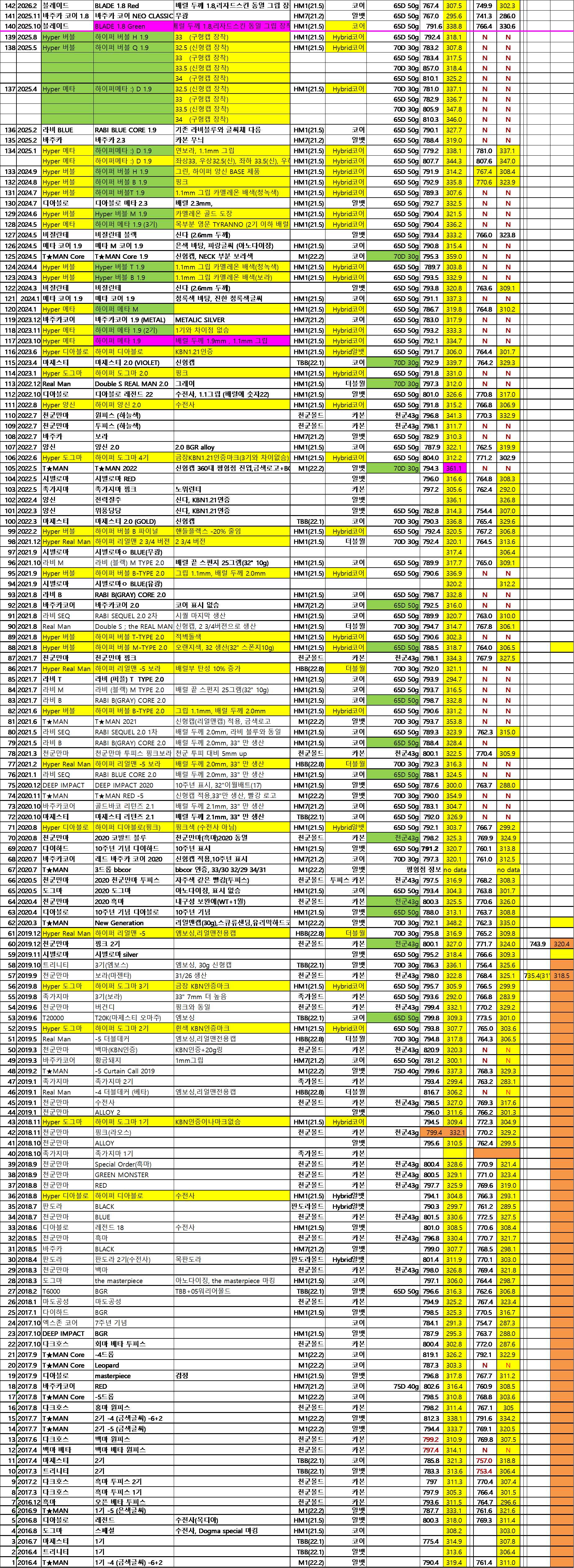 여기 써있는 수치는 자료실에 나온 5~10자루 샘플링 평균 수치입니다. 분명히 + - 가 존재하오니 감안하십시오.