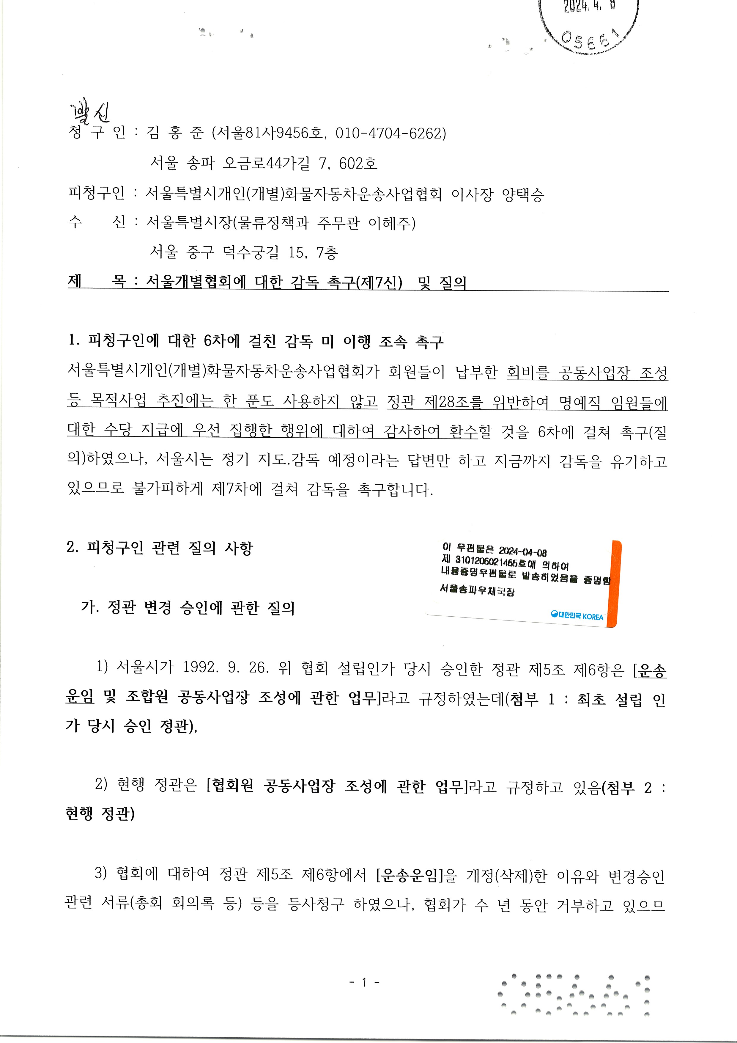 서울시 개별협회 감독 촉구(제7신) - 공동사업장 추진 관련 등 작성자비빔밥|작성시간24.04.08|조회수30 목록 댓글 0 글자크기 작게가 글자크기 크게가 다음검색 현재 게시글 추가 기능 열기 북마크 공유하기 신고 센터로 신고 댓글 댓글 0 댓글쓰기 답글쓰기 댓글 리스트
