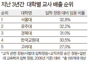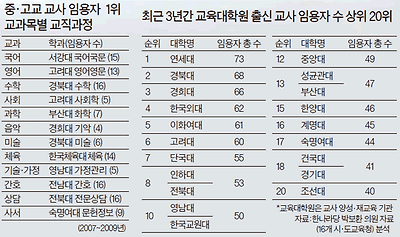 (교육대학원 합격자 수는 2007~2009년 3년간의 합산치. 양성과정 정원 대비 합격률로 환산하면 1위인 연세대가 약 8%)