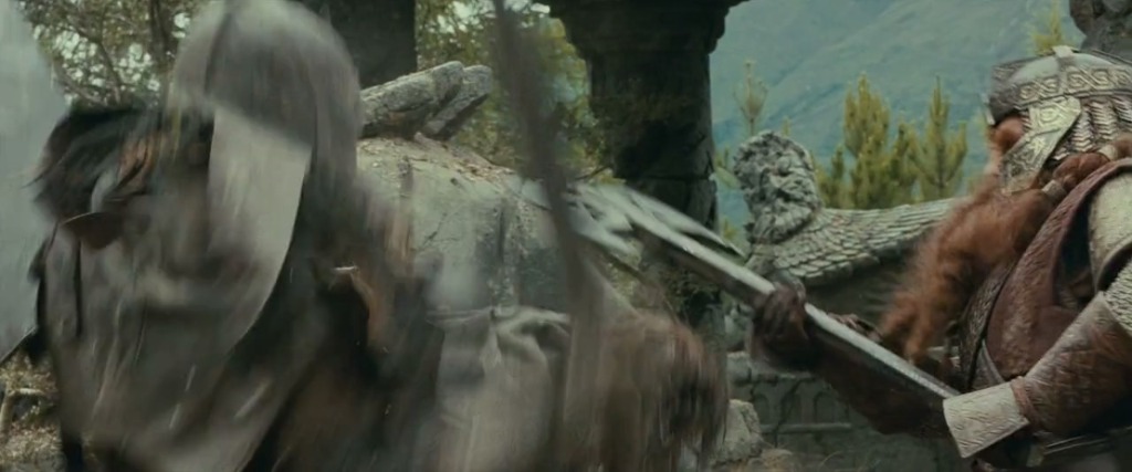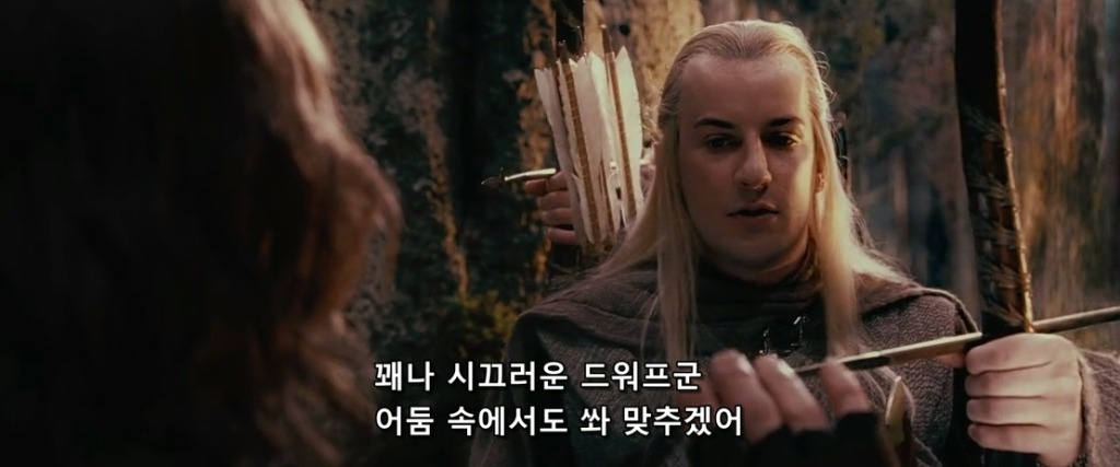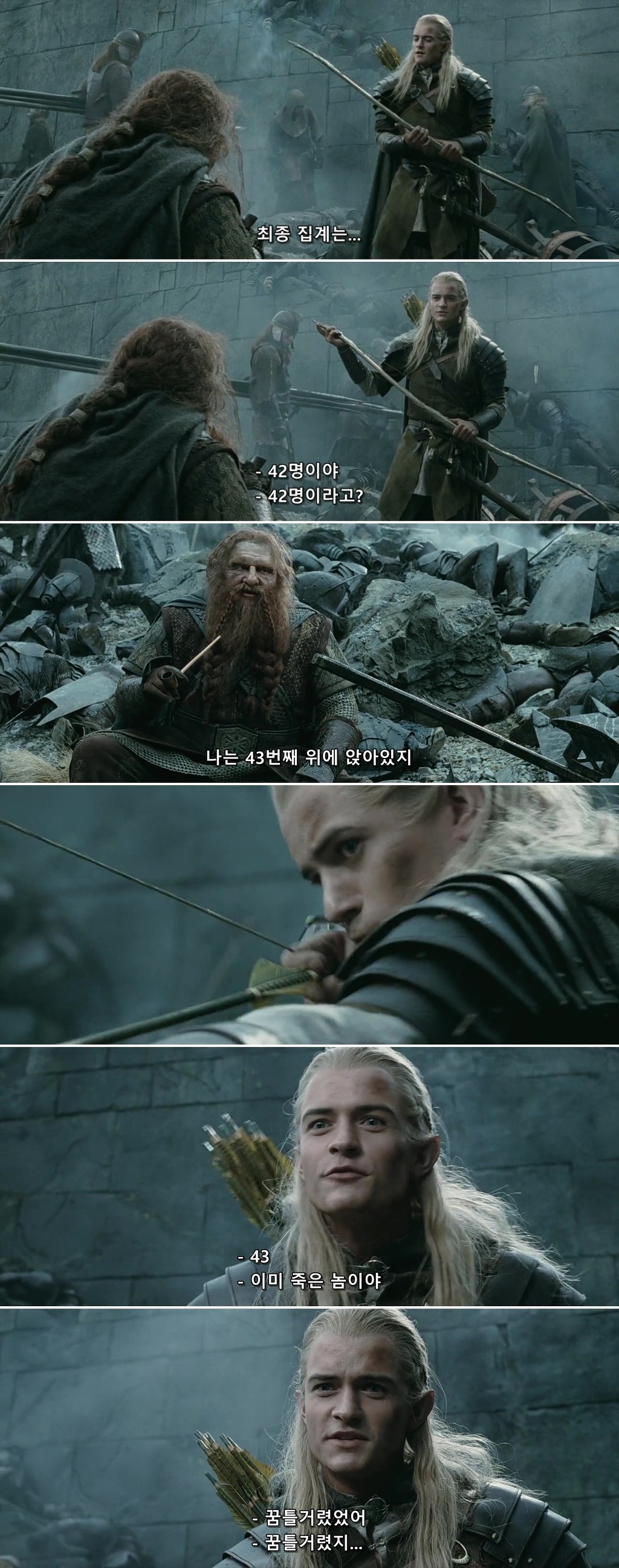 김리가 깔고앉은 오크시체를 쏘아버리는 레골라스.