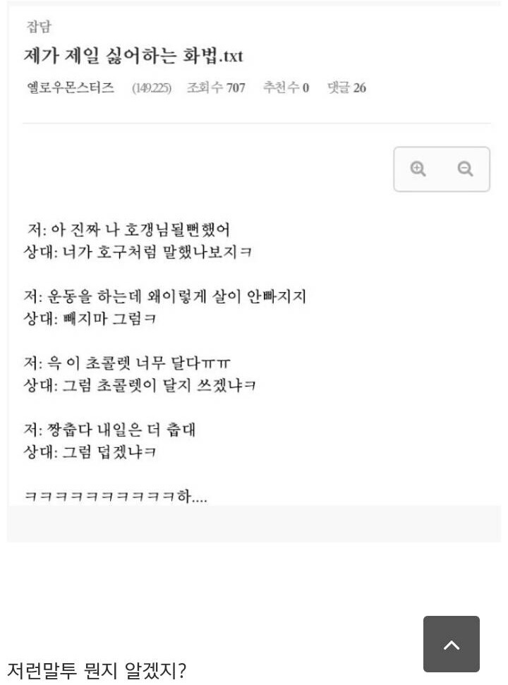 [공감유머]매우 빡치는 화법 작성자정윤호 아내|작성시간16.01.08|조회수10,114 목록 댓글 33 글자크기 작게가 글자크기 크게가 할말을 잃게 만드는 너란 화법[1차 출처 : http://humorbook.co.kr/bbs/board.php?bo_table=humor&wr_id=670937#_adtep2차 출처 : 네이트판] 다음검색 현재 게시글 추가 기능 열기 북마크 공유하기 신고 센터로 신고 댓글 댓글 33 댓글쓰기 답글쓰기 댓글 리스트 작성자드래곤본 | 작성시간 16.01.08 답정너에게 매우 효과적. 작성자텐리 | 작성시간 16.01.08 귀찮아 죽겠는데 눈치 없이 계~속 말시키는 넌씨눈에게 효과적 작성자인생...새옹지마.. | 작성시간 16.01.08 에홍 자기 기분 안좋으면 저렇게 얘기하던 친구가 있었는뎁... 작성자우꼬야 | 작성시간 16.01.09 너가 호구처럼 말했나보지ㅋ 이미지 확대 답댓글 작성자우꼬야 | 작성시간 16.01.09 응 그런거같아... 반성해야겠어..^^!!!! 댓글 전체보기