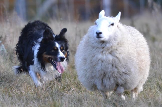 양을 물고 짖으며 바쁘게 뛰어다님