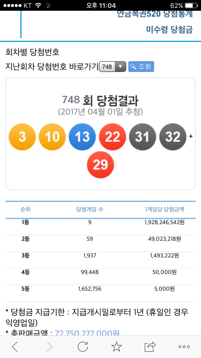 작성자우히히78 작성시간 17.10.29 이것보고 이번 778회 검색해보니 한게임당 1등 당첨금액이 62억?