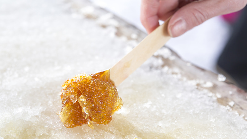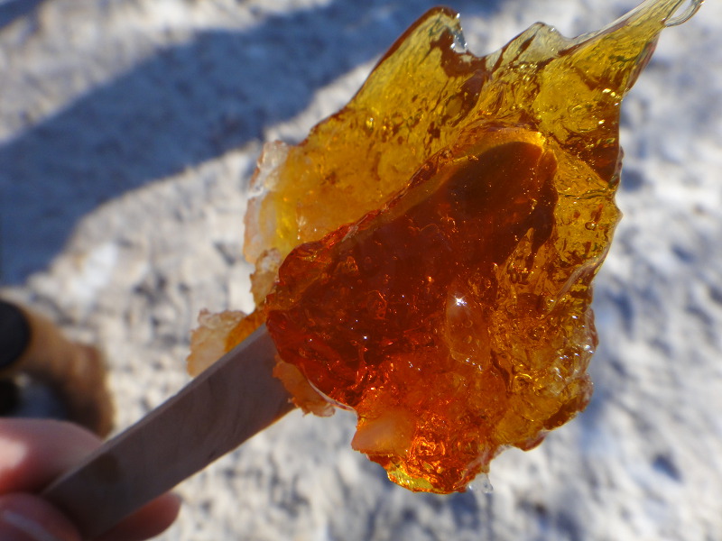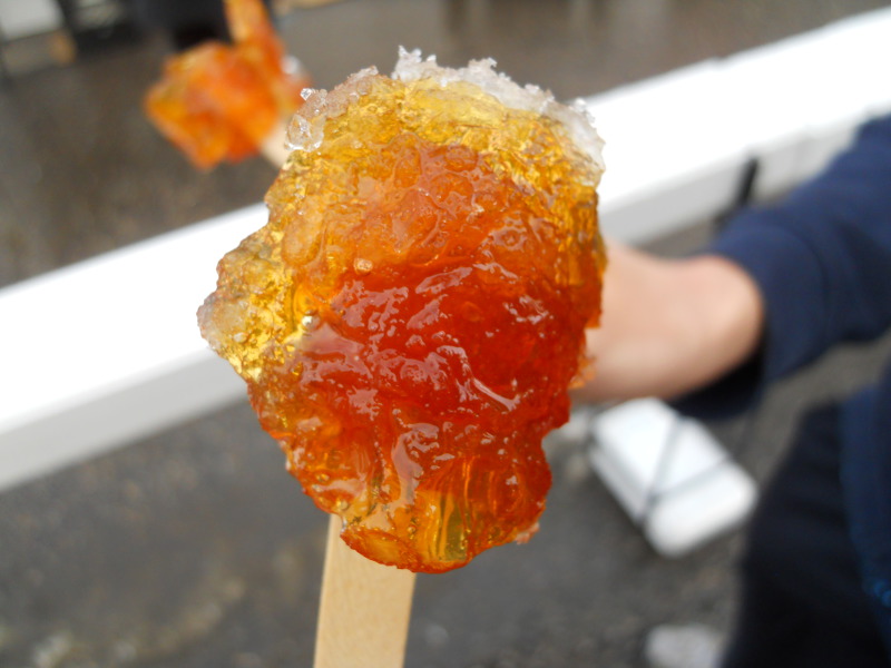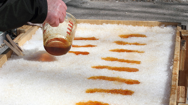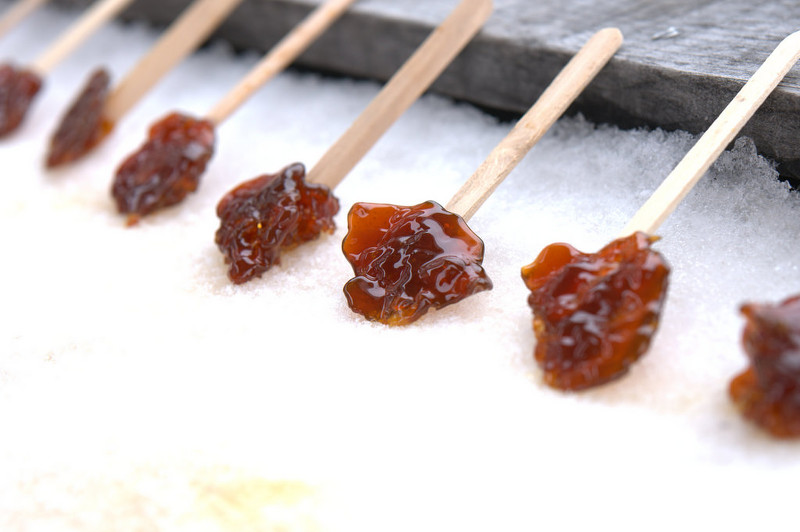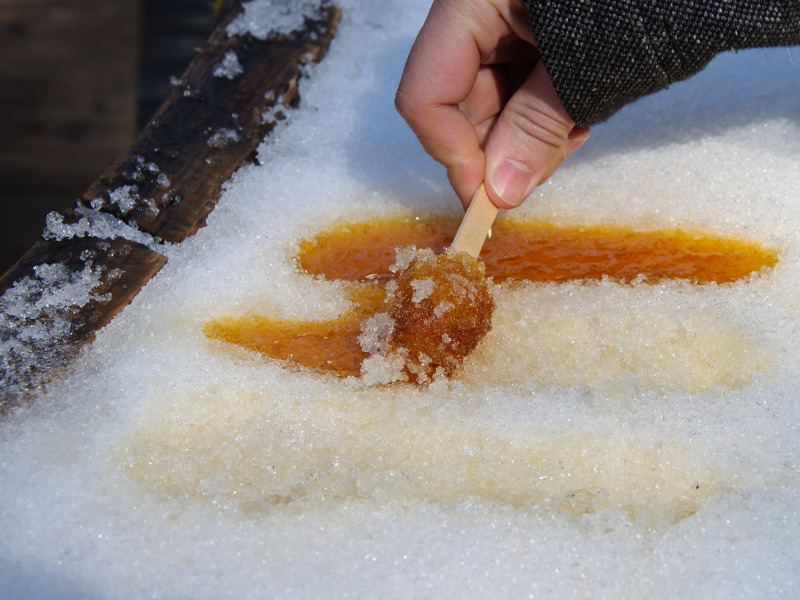 뜨겁게 달군 메이플 시럽을 눈 위에 길게 부어 나무젓가락이나 포크로 돌돌 말아 캔디로 만들어 먹는다고 하긔.