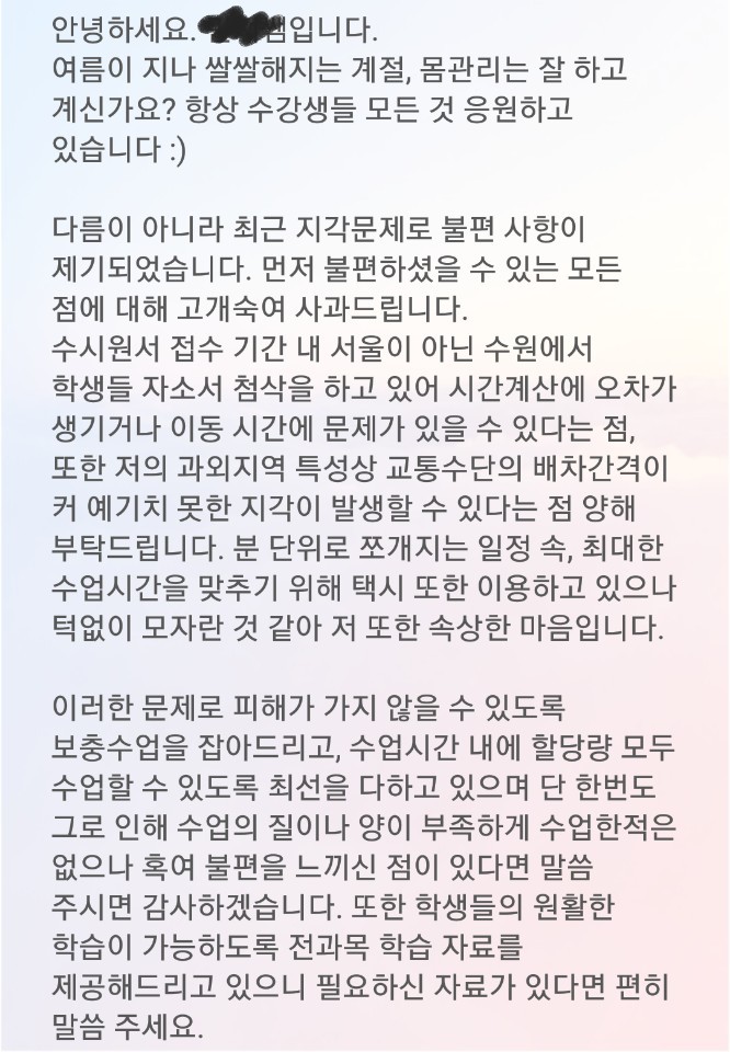 글쓴: 근데 그럼 쌤이 늦으신거 제가 이해 해드려야하나요?