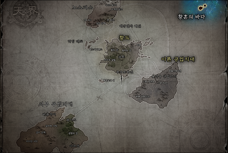 스토리의 큰 축이 되는 지역은 황도, 무법지대, 그리고 이튼 공업지대입니다. 노스피스는 그저 귀족들이 사는 땅 정도로 묘사됩니다. 이 네 대륙은 원래 하나의 대륙이었으나 바칼의 사망 당시 터져나온 힘으로 대륙이 쪼개져 네개로 분할되었으며 이를 잇기위해 황국은 천계간 대륙을 해상열차로 연결하게 됩니다. 하지만 설계과정의 실수로 서부로는 열차가 가지 않게 되어 황국의 지원이 끊기고 이곳은 무법지대가 됩니다.