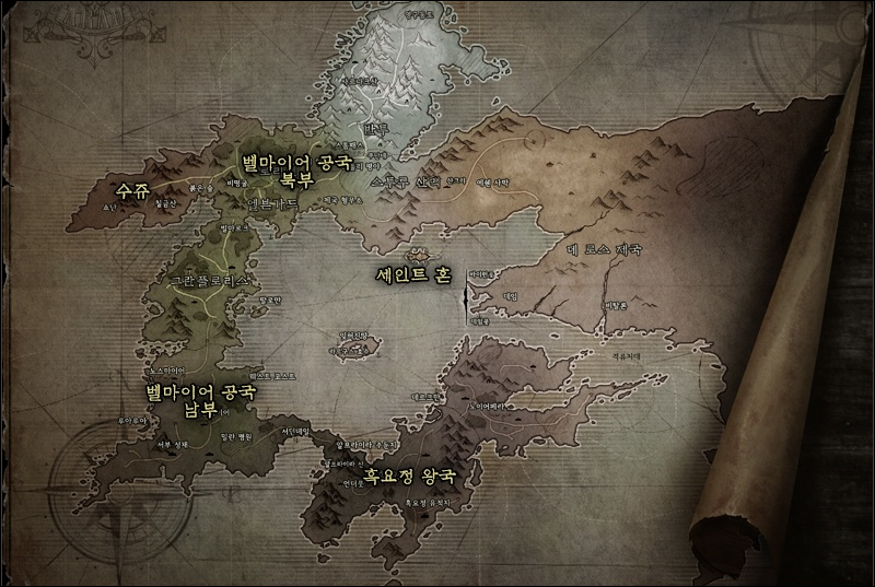 스토리의 큰 축이 되는 땅은 데 로스 제국, 벨마이어 공국, 슈주입니다. 흑요정 왕국과 반투 또한 배경과 스토리에서 큰 비중은 아니지만 특정 레벨대에서 저 곳에 위치한 던전을 돌게 됩니다. 잊혀진땅은 중요할것같은 위치에 있으나 아무 비중이 없습니다...
