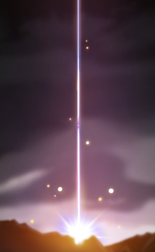 검자루로 겨우 버티고 있는 대장 뒤로 메이플 월드를 환하게 비추는 빛의 기둥이 하늘로 올라갑니다.