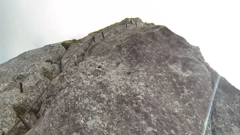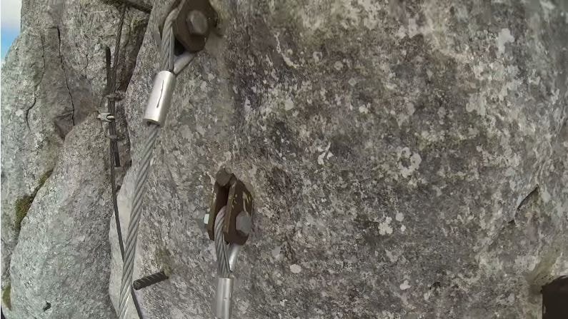 눈 앞에 절벽이 기다리고 있고 저 왼쪽부터 시작하는 바위에 박한 철근에 의지해서 암벽등반 해야 함.