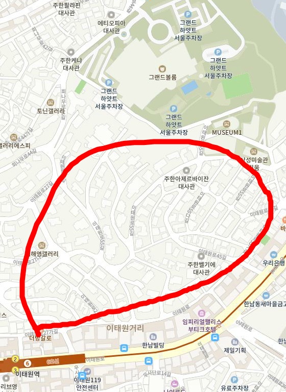 09년 본인은 한남동 하얏트 호텔에서 이태원역으로 내려가는 길 쪽에 살았음