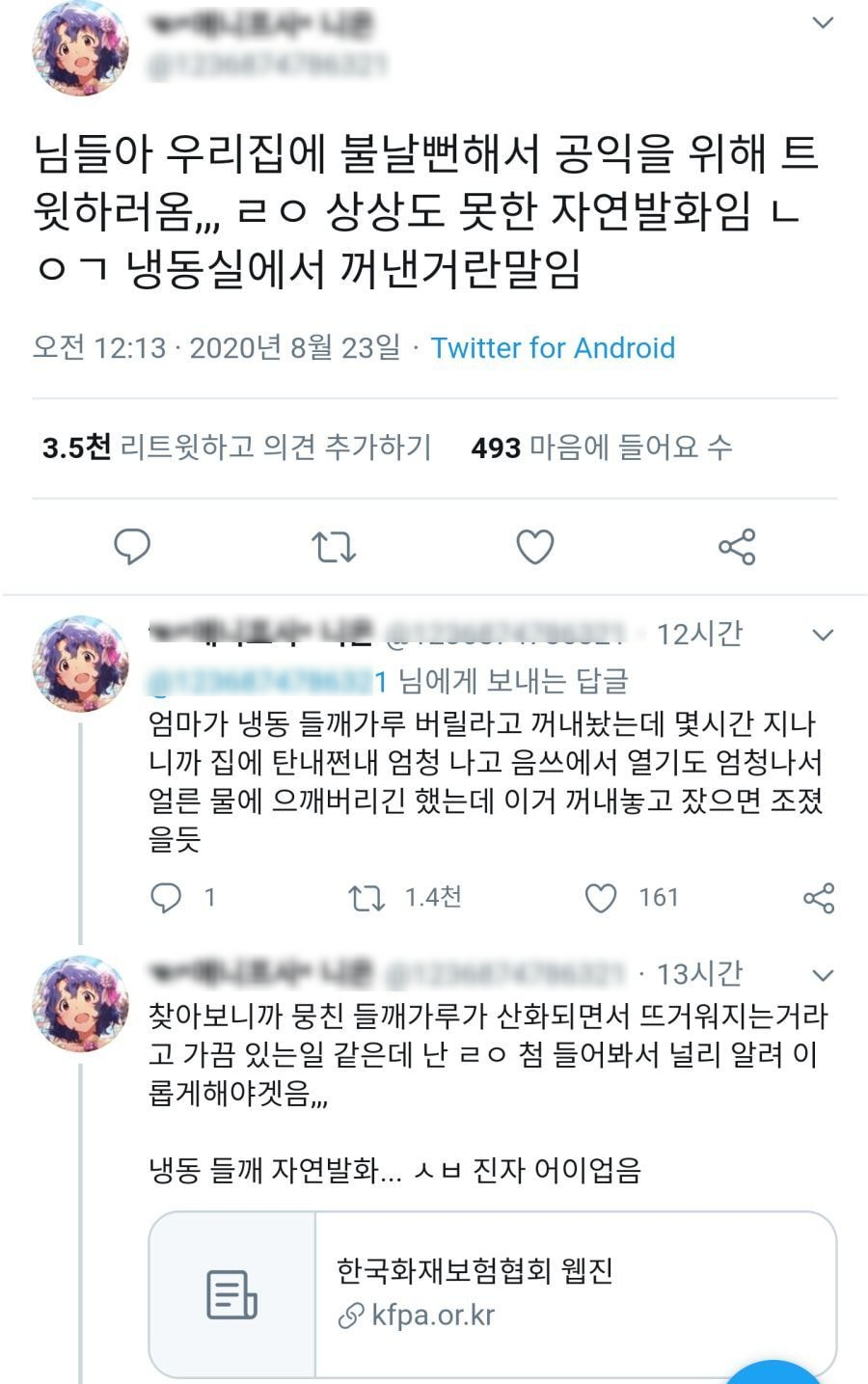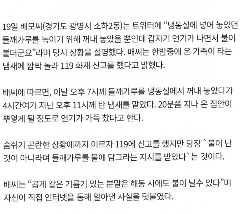 들깨 관련 자연발화는 해동을 위해 냉동실에 넣어 두었던 들깨가루를 냉장고 밖에 꺼내 두었는데 3~4시간이 지난 시점에서 자연발화하는 사례이다.