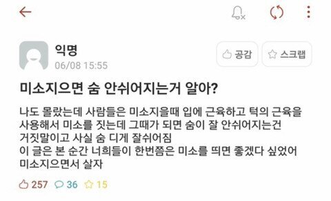 [감동]인체의 신비로운 비밀 작성자포켓몬 팬텀|작성시간20.09.06|조회수6,282 목록 댓글 10 글자크기 작게가 글자크기 크게가 출처 : 웃대 다음검색 현재 게시글 추가 기능 열기 북마크 공유하기 신고 센터로 신고 댓글 댓글 10 댓글쓰기 답글쓰기 댓글 리스트 작성자태태야찐이해 | 작성시간 20.09.06 ㅋㅋㅋㅋㅋㅋㅋㅋ의도가 이뻐서 봐줌 작성자지야암 | 작성시간 20.09.06 나도 낚임 ㅎㅎ 작성자엑소좋아하는데요 | 작성시간 20.09.06 입꼬리 올리고 웃으면서 숨 쉬었네ㅋㅋㅋㅋ 답댓글 작성자아바라처돌이 | 작성시간 20.09.06 22222 작성자공룡아빠 | 작성시간 20.09.06 그것이 호흡이니까 이미지 확대 댓글 전체보기