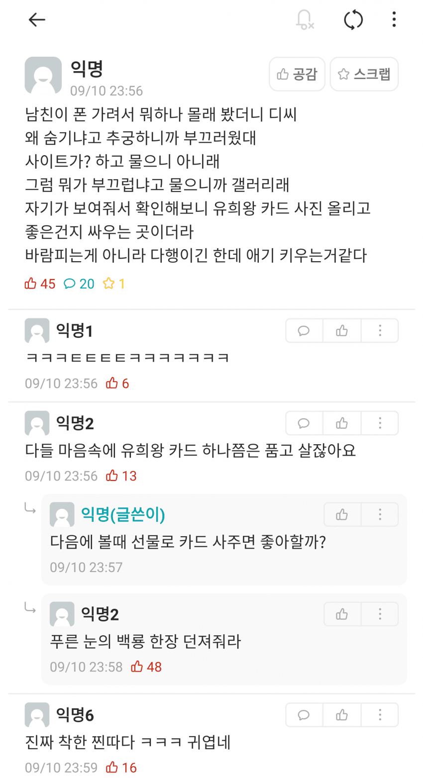 작성자지야암 작성시간 20.09.11 내 남친도 항상 폰을 가리는 느낌을 받았는데