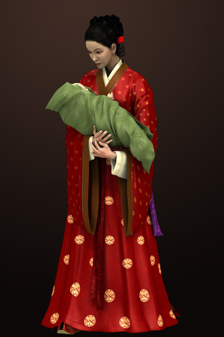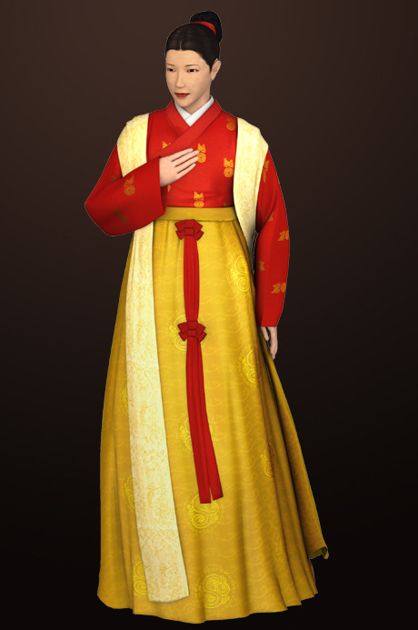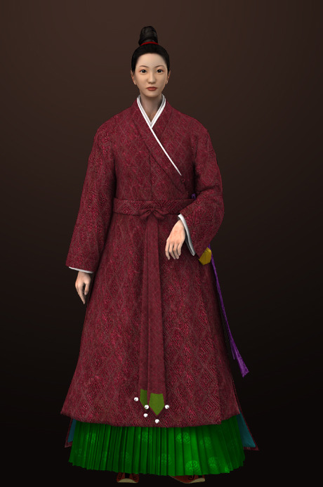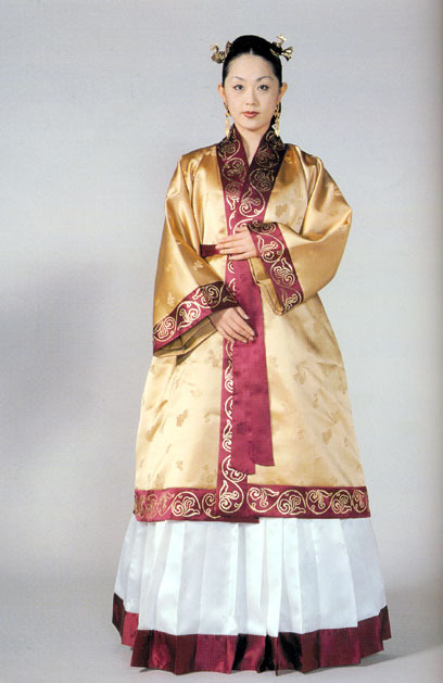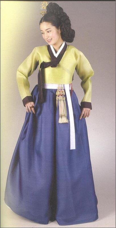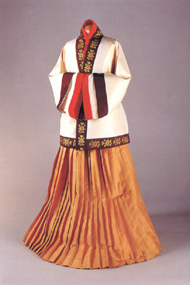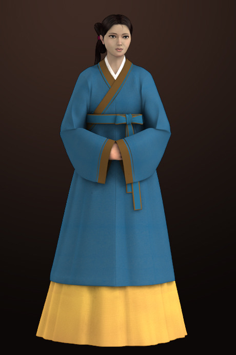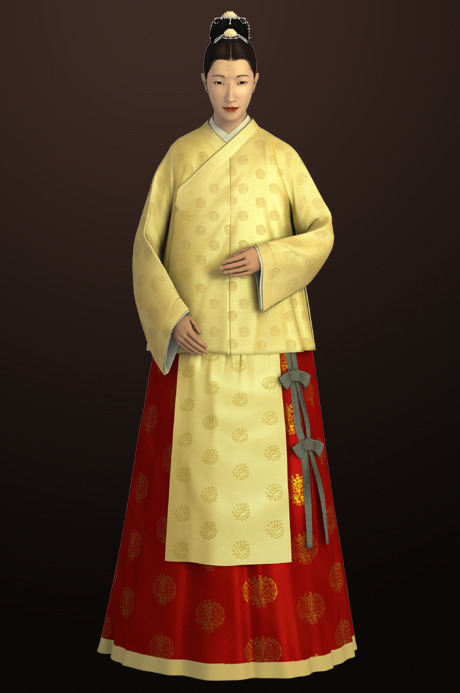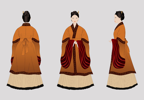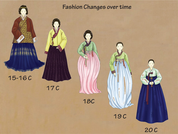 배경:고려 말에서 조선 초에 통일신라시기의 옷입는 방법인 저고리 위에 치마를 입는 양식이 치마 위에 저고리를 입는 방법과 혼재되어 사용되다가 고려가 망하고 조선조에 들어가면서 조금씩 지금처럼 치마 위에 저고리를 입는 착장방법으로 통일된 것이다.