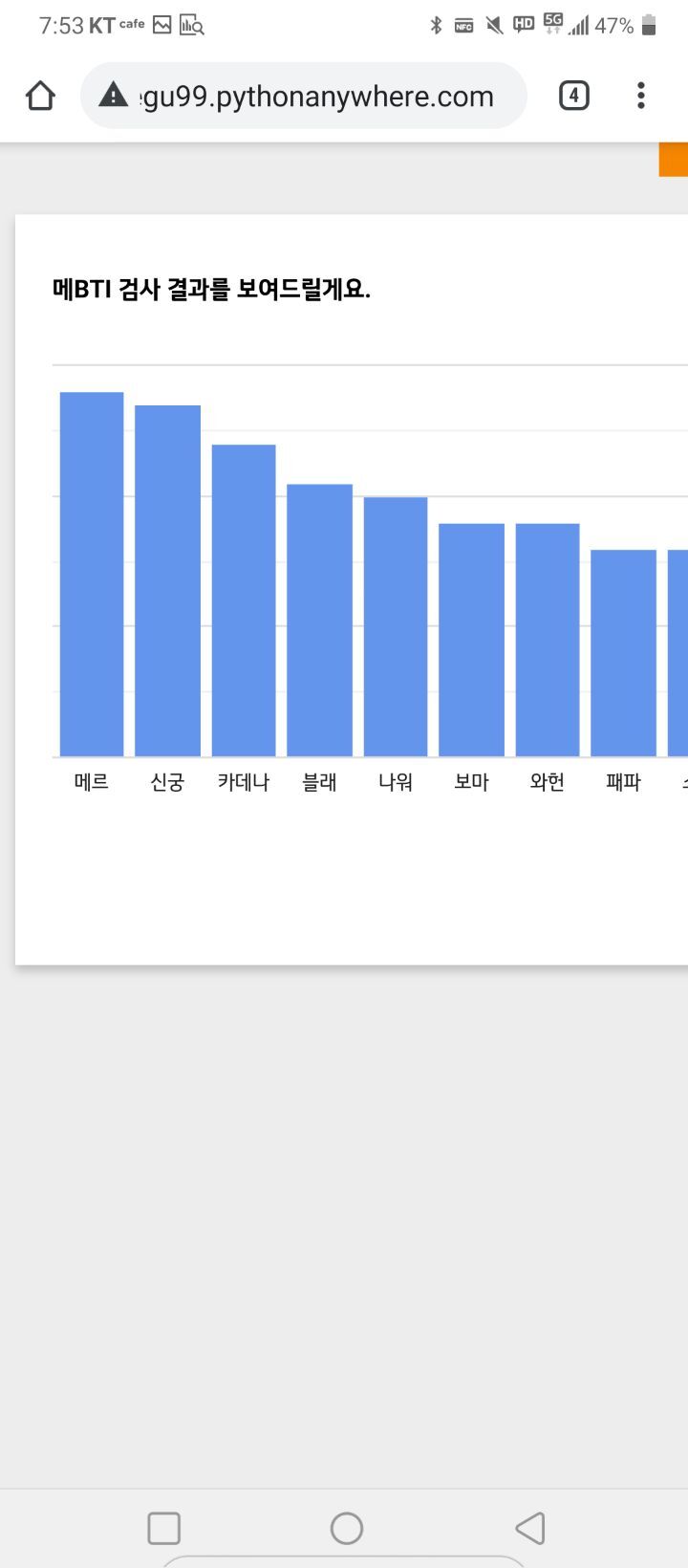 [스크랩] [기타]나와 어울리는 메이플 직업은? 메이플스토리 MBTI 작성자정채연|작성시간21.01.31|조회수1,614 목록 댓글 10 글자크기 작게가 글자크기 크게가 http://haegu99.pythonanywhere.com/mbti글쓴이는 실제 본캐 메르 나옴 ㅎㅎ 다음검색 스크랩 원문 : 도탁스 (DOTAX) 현재 게시글 추가 기능 열기 북마크 공유하기 신고 센터로 신고 댓글 댓글 10 댓글쓰기 답글쓰기 댓글 리스트 작성자솔로만만세!! | 작성시간 21.02.01 아델 나왔다 ㅋㅋㅋ 내가 키우는것중 제일 렙 높은건데 ㅋㅋ 작성자구도경(더 게임 0시를 향하여) | 작성시간 21.02.01 나로, 엔버 공동 1위 작성자공상지결 | 작성시간 21.02.01 패파 나왔다 궁수 조와 작성자나으우야 | 작성시간 21.02.01 헐 소름 루미나왔는데 진짜 루미너스 본캐였었음... 우와; 작성자가지가지한다다 | 작성시간 21.02.01 과거본캐인썬콜.. 댓글 전체보기