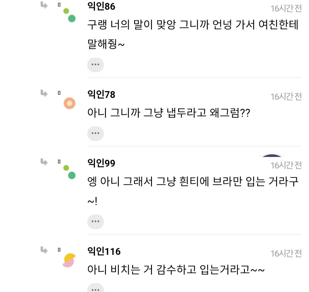 작성자Fly me to the Moon 작성시간 21.06.22 브라가 비치는게 중요한게 아니잖아 저시키 그냥 남의 말은 받아들일 생각이 애초에 없는데 뭔 대화가 되겠니 여친한테도 말하고 길가는 여자들 다 잡고 말해라 브라 비치니까 흰티 입지 말고 색깔 있는거 입으라고 으휴