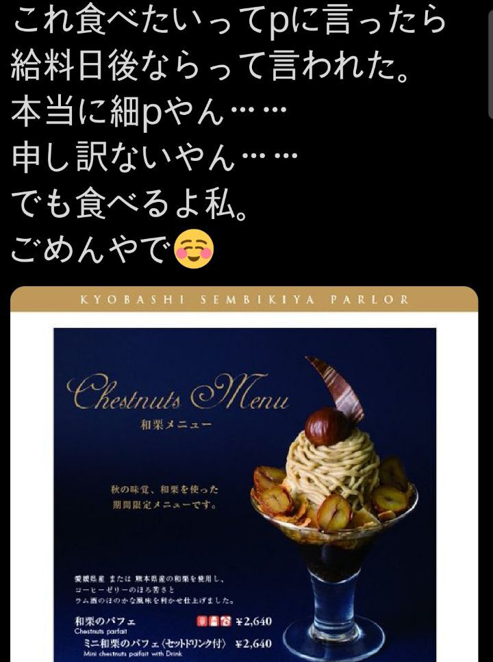 2천엔하는 파르페 먹고 싶다고 파파에게 말했더니 월급날 다음에 사준다고 말했다